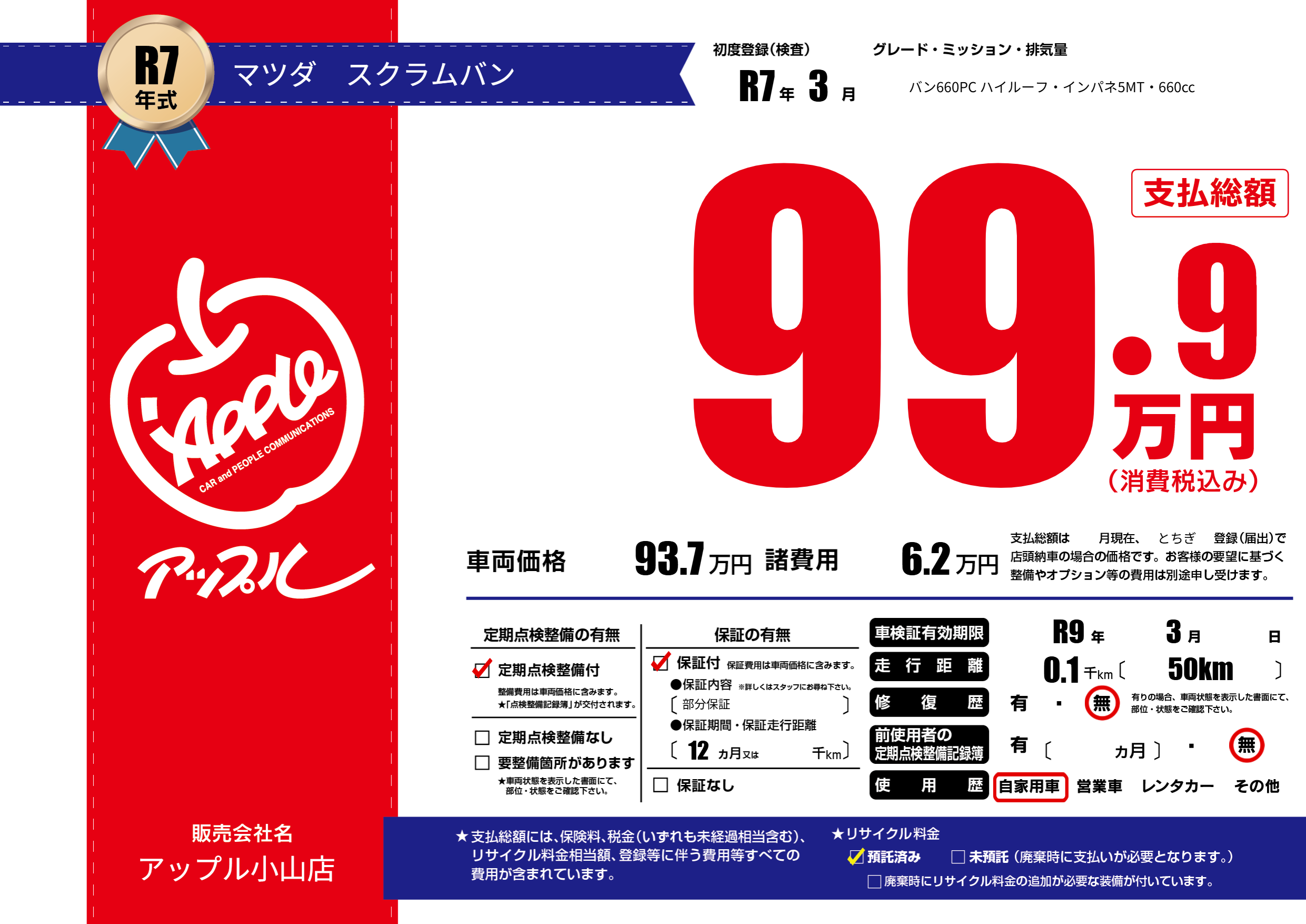 | 車名 | マツダ スクラムバン | グレード ミッション 排気量 |