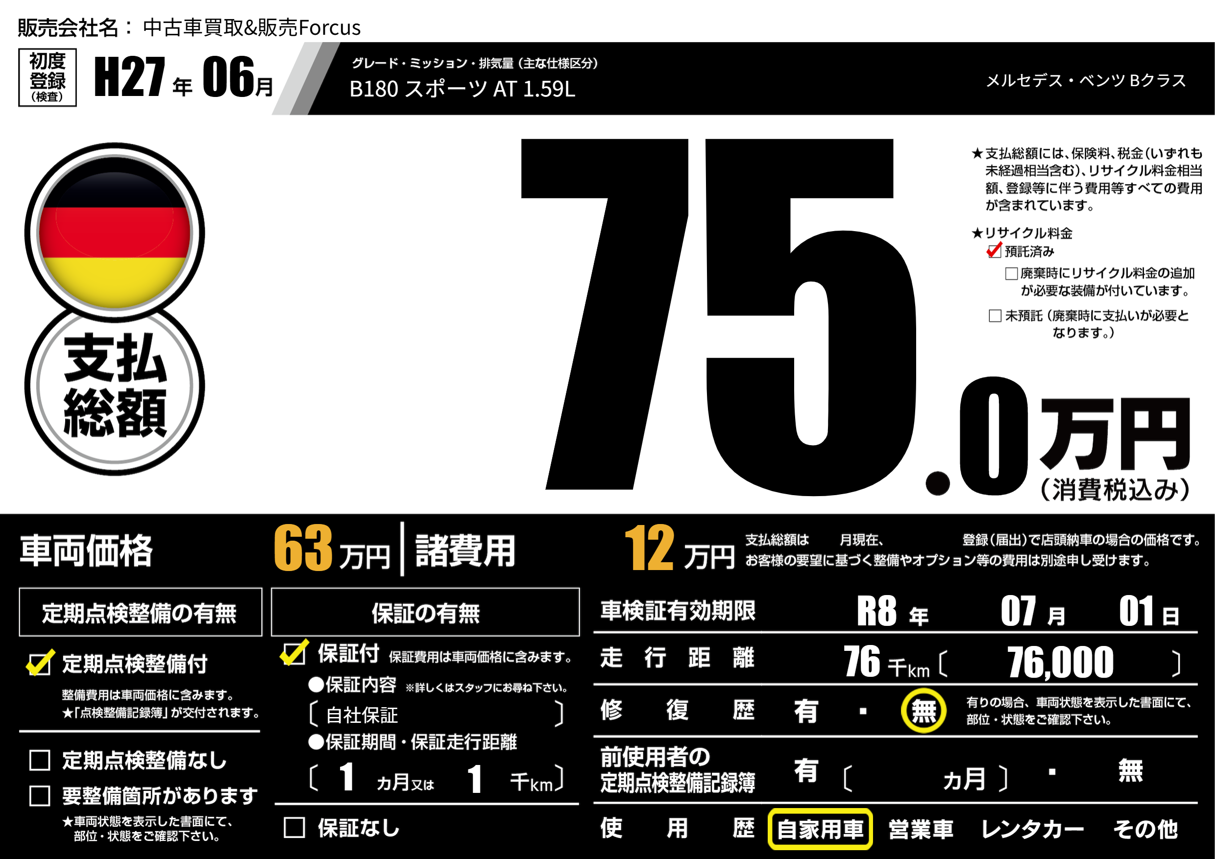 | 車名 | メルセデス・ベンツ Bクラス | グレード ミッション 排気量 |