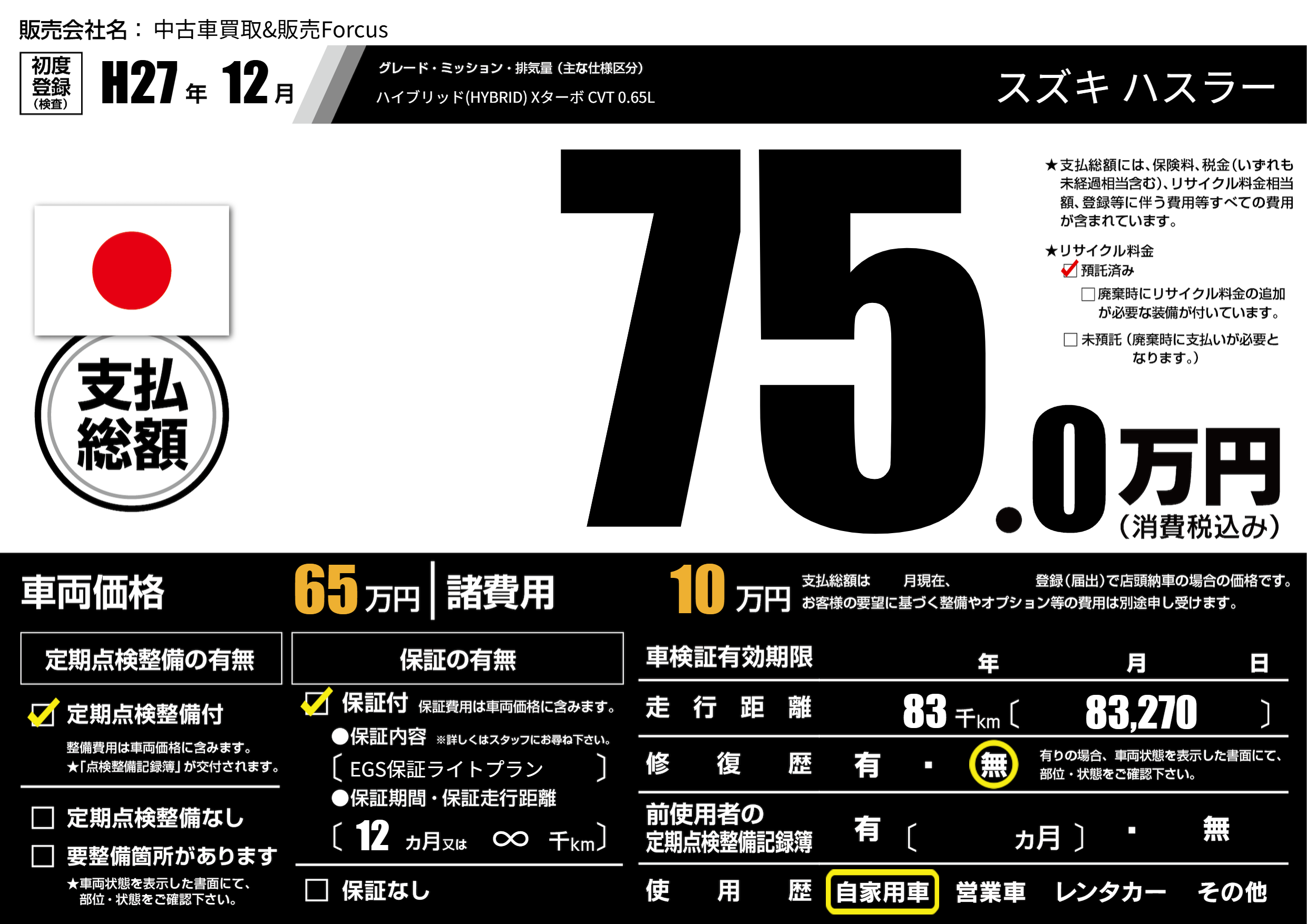 | 車名 | スズキ ハスラー | グレード ミッション 排気量 |