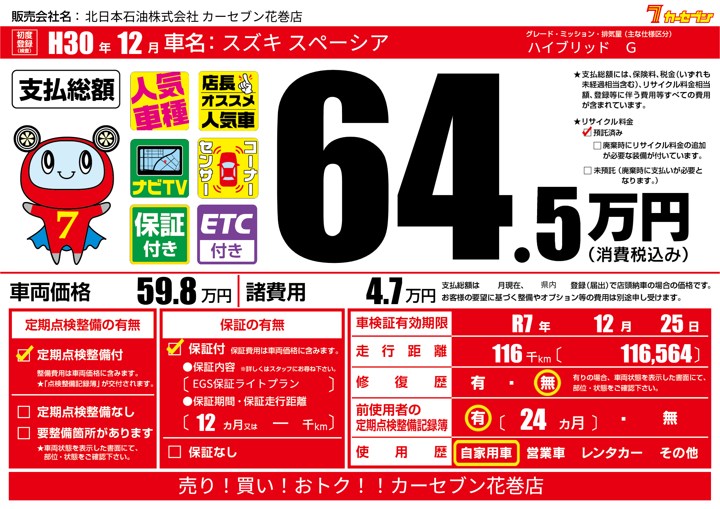 | 走行キロ | 11.6万km | 初年度登録 | H30年12月 |