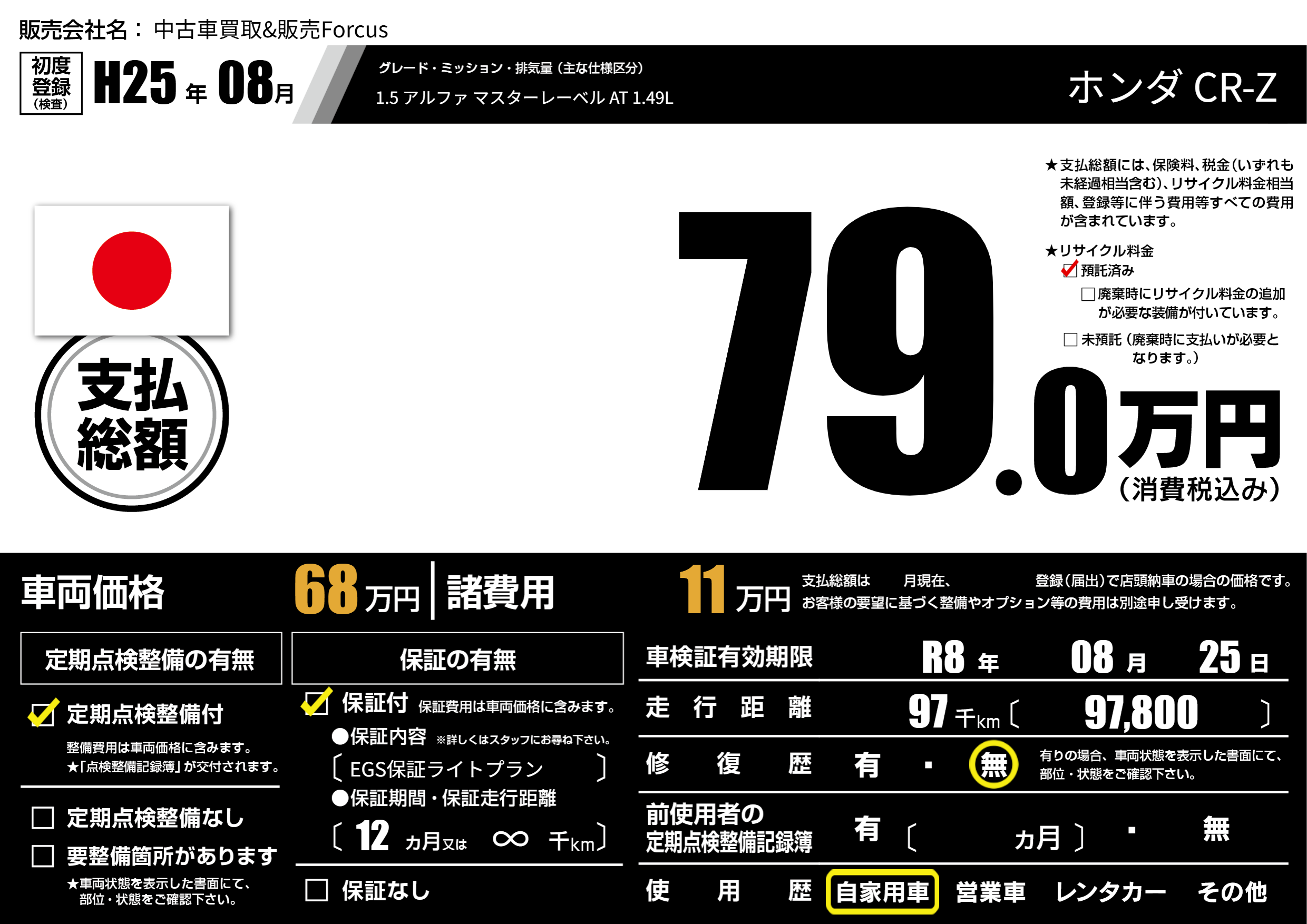 | 車名 | ホンダ CR-Z | グレード ミッション 排気量 |