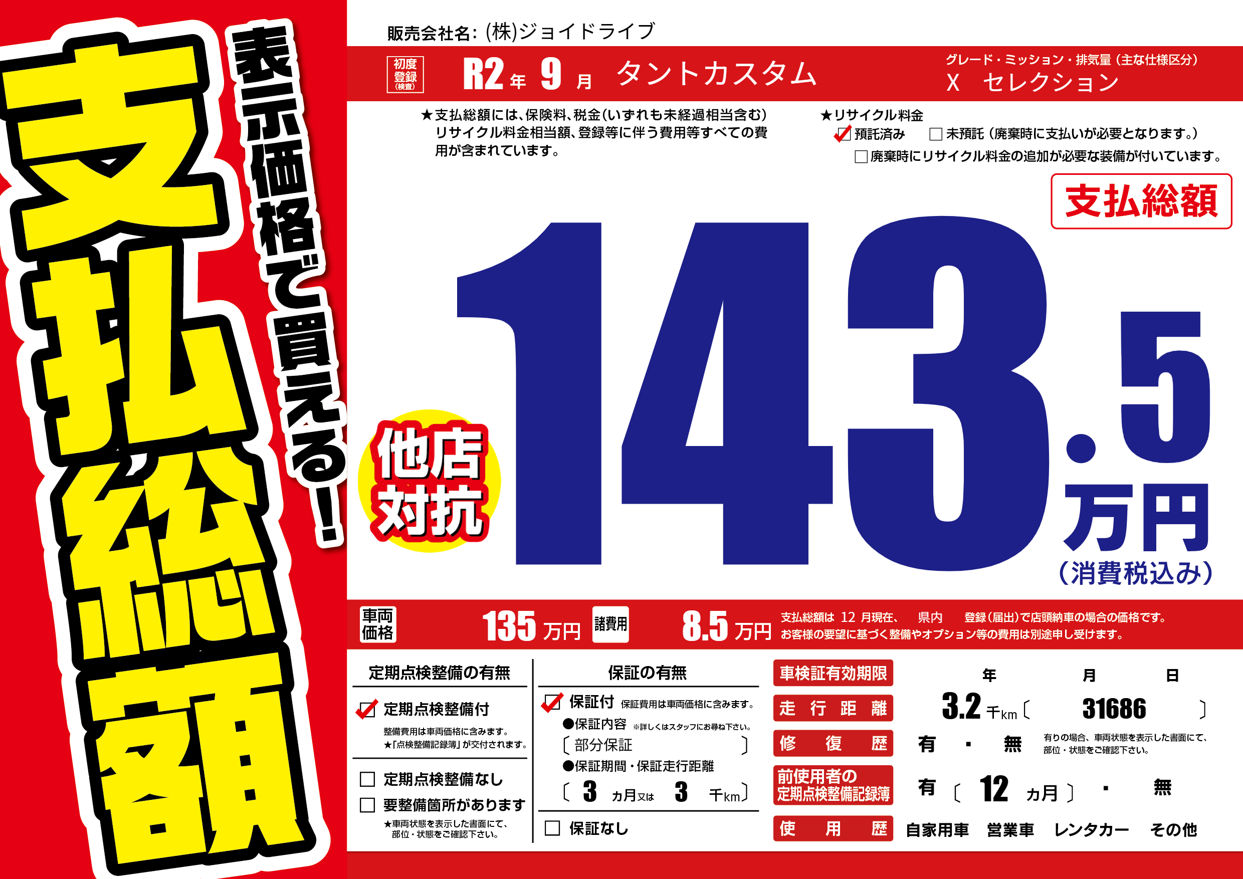保証付き 保証内容(部分保証) 3ヶ月または(3)千kmまで |