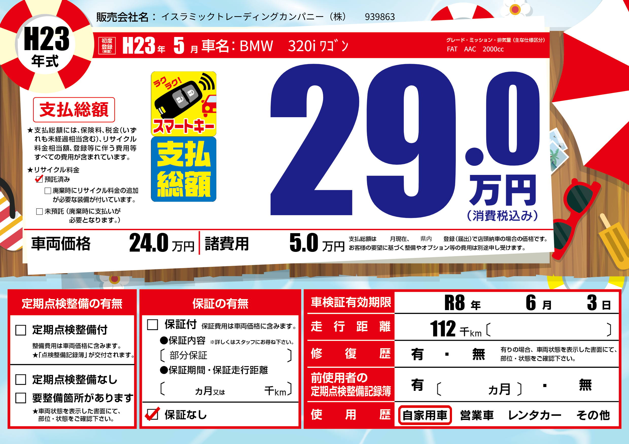 | 車名 | BMW 320i ワゴン | グレード ミッション 排気量 |