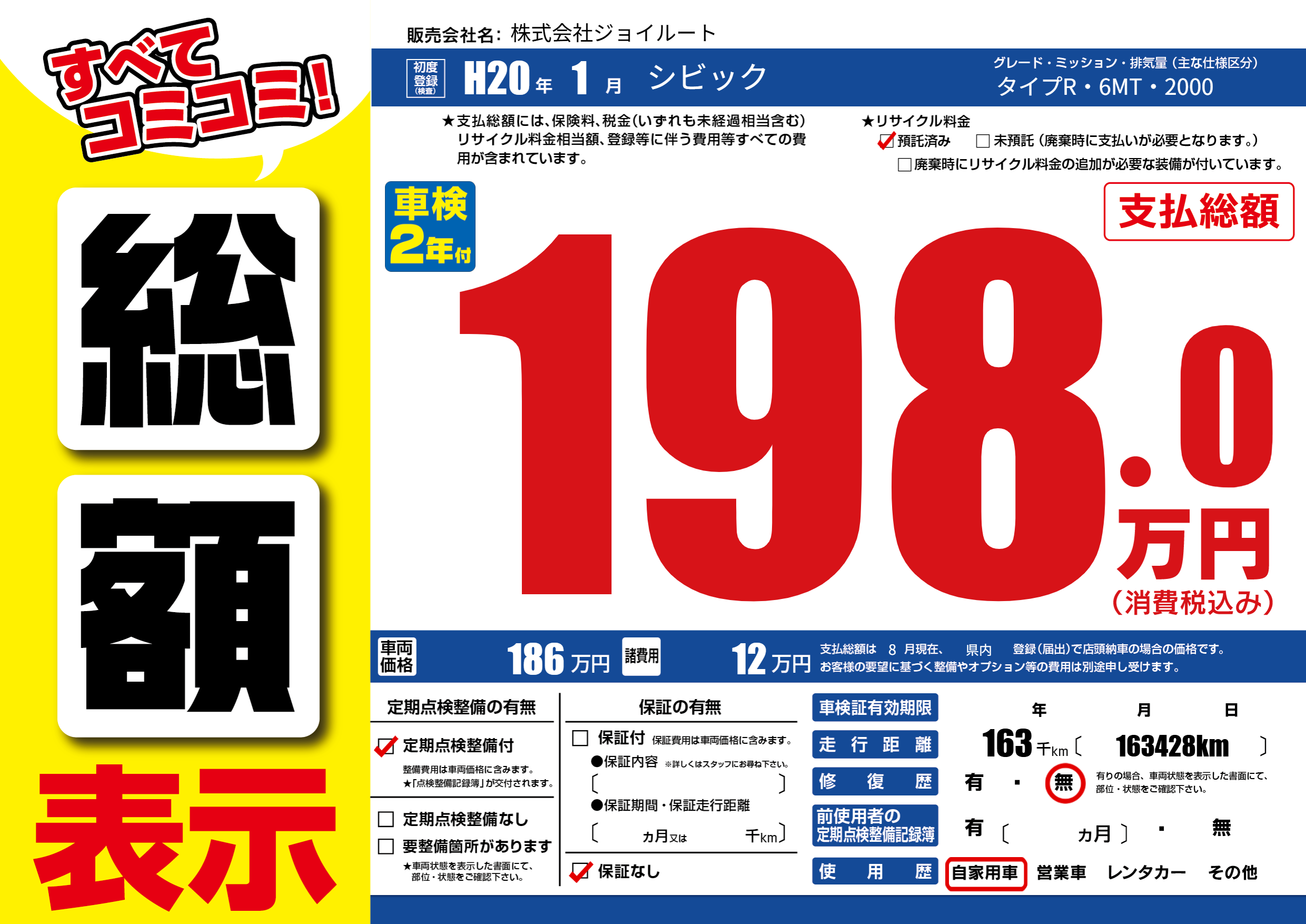 | 走行キロ | 16.3万km | 初年度登録 | H20年1月 |