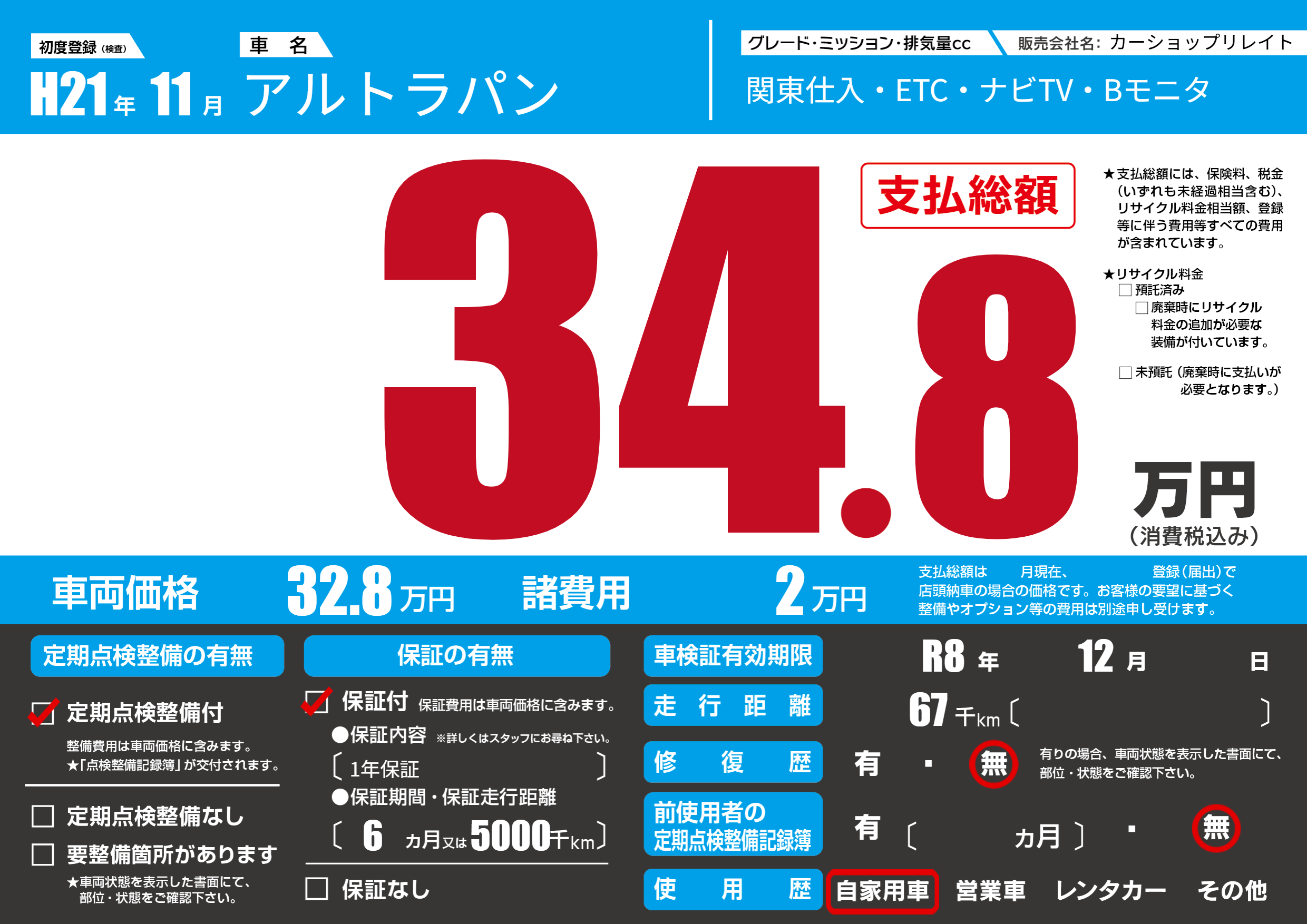 | 走行キロ | 6.7万km | 初年度登録 | H21年11月 |