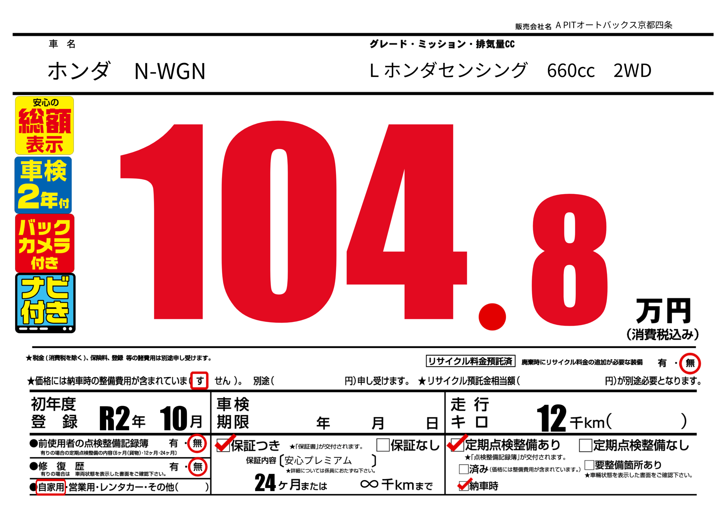 保証付き 保証内容(安心プレミアム) 24ヶ月または∞千km |