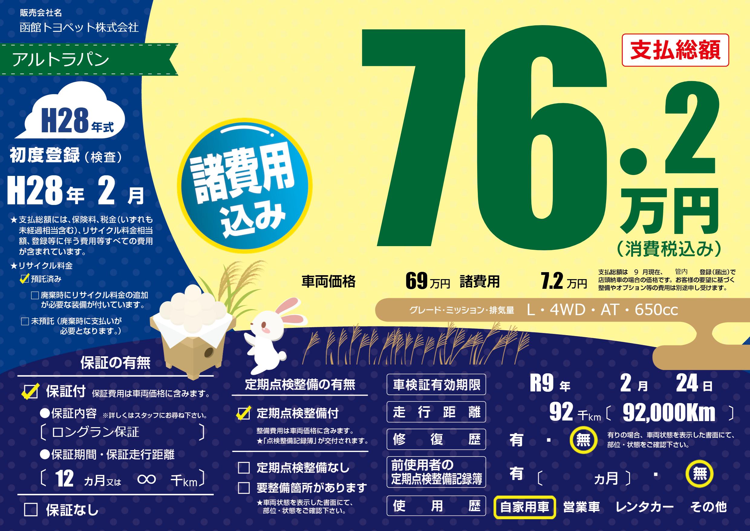 | 走行キロ | 9.2万km | 初年度登録 | H28年2月 |