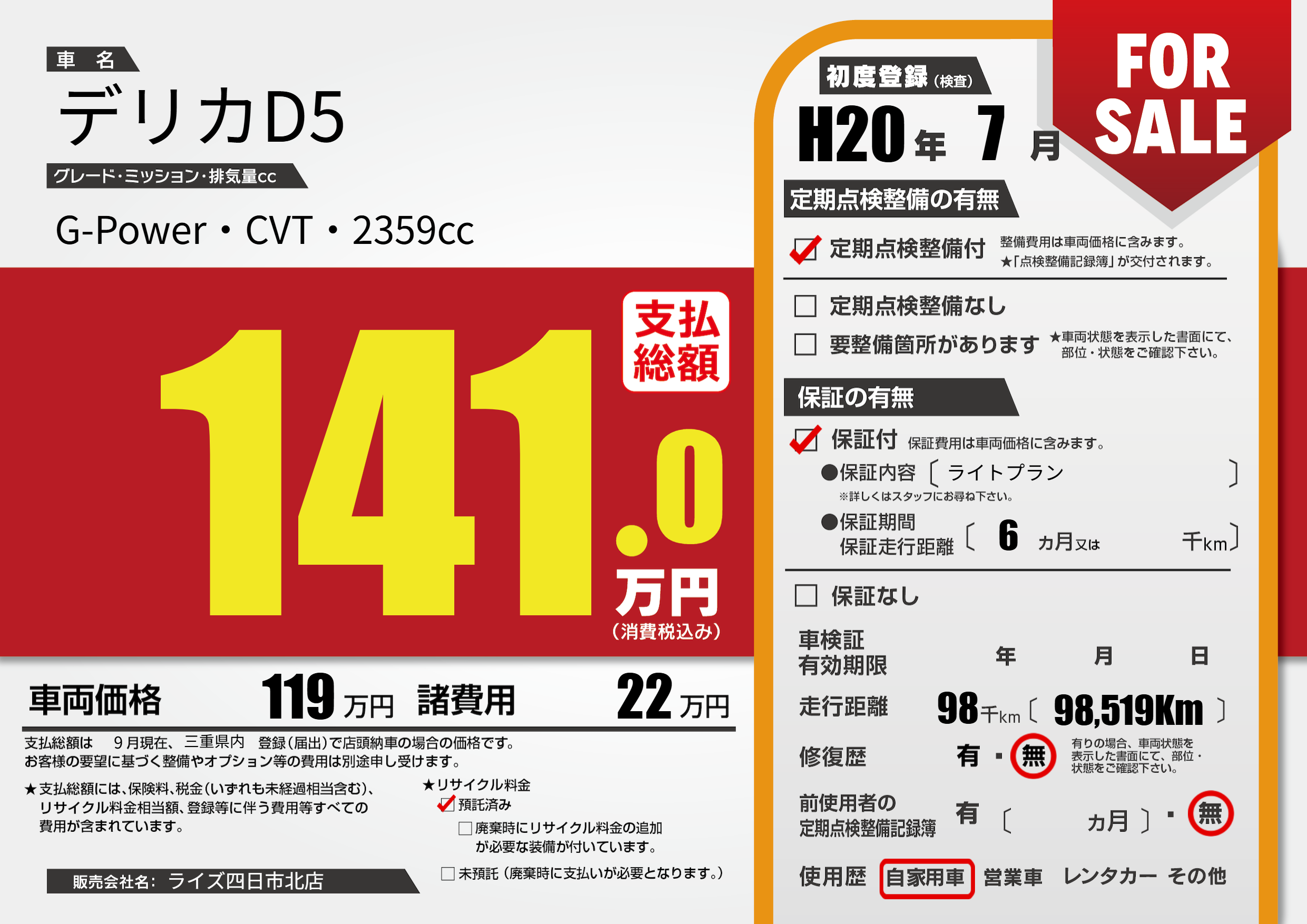 | 走行キロ | 9.8万km | 初年度登録 | H20年7月 |