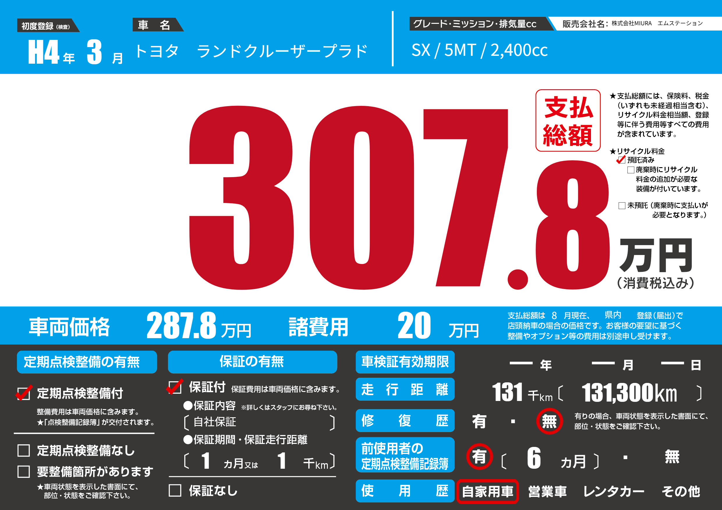 | 走行キロ | 13.1万km | 初年度登録 | H4年3月 |