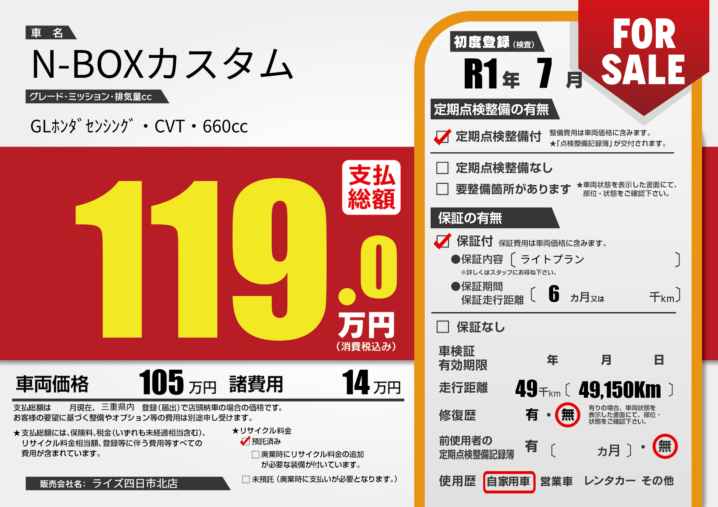 | 走行キロ | 4.9万km | 初年度登録 | R1年7月 |