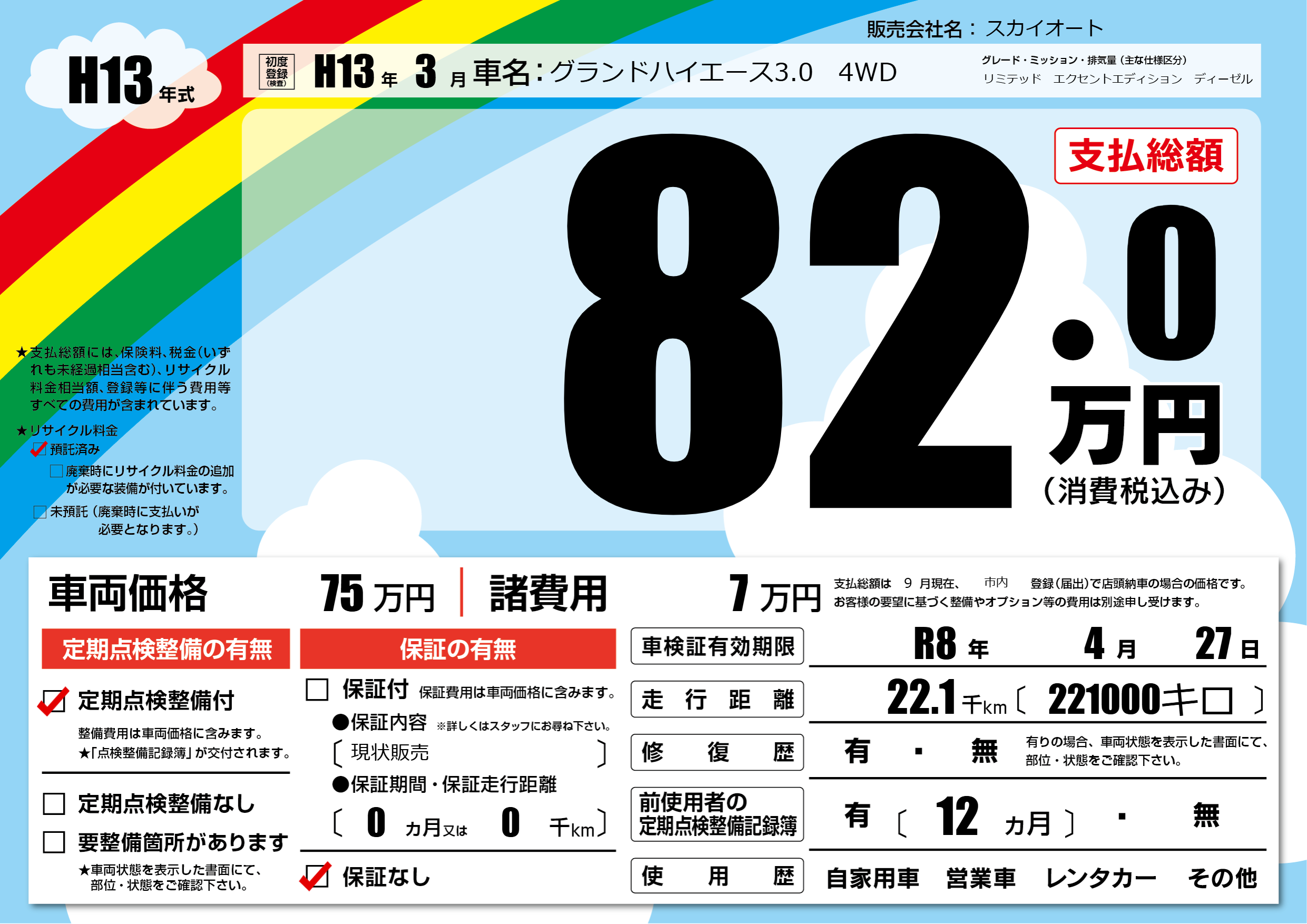 | 車名 | グランドハイエース3.0 4WD | グレード ミッション 排気量 |