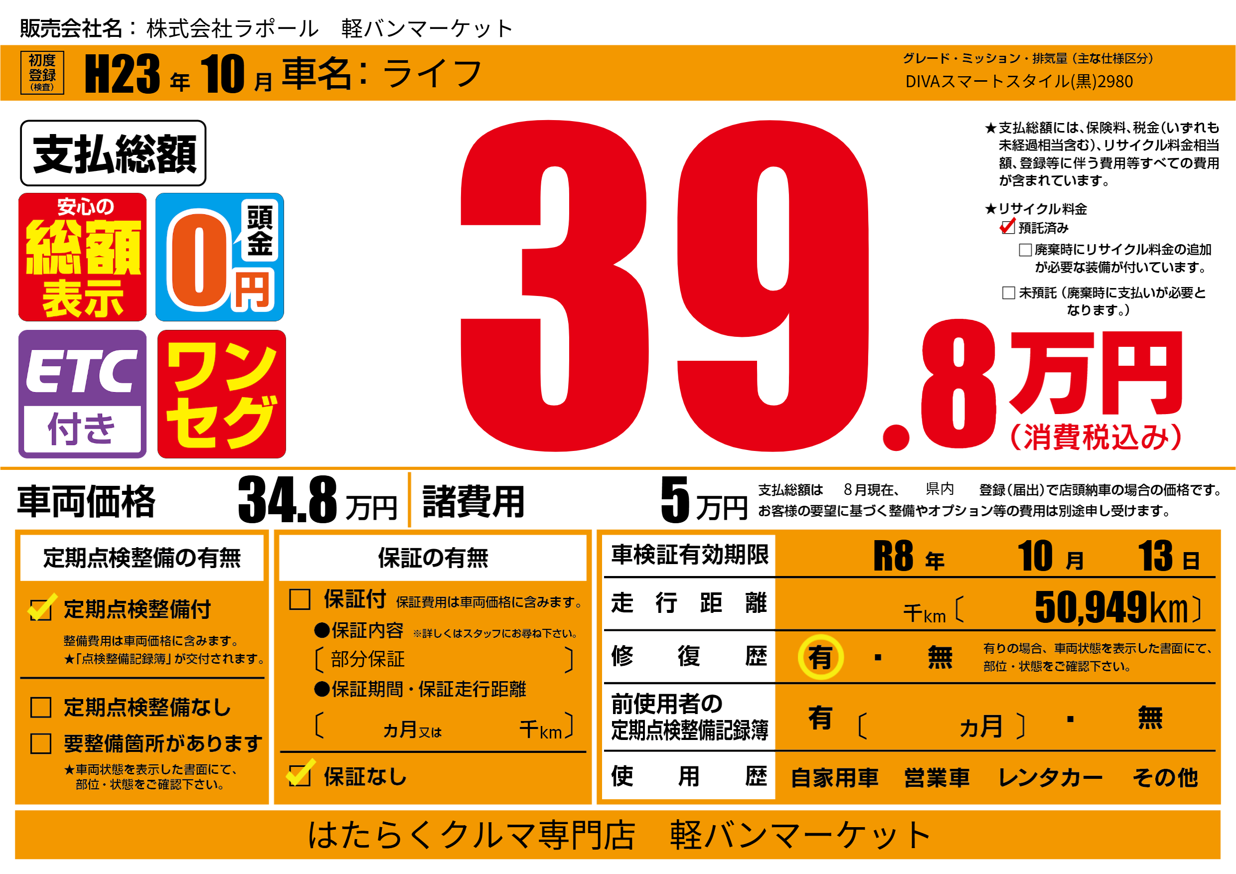 なし | 車検制限 | R8年10月13月 |