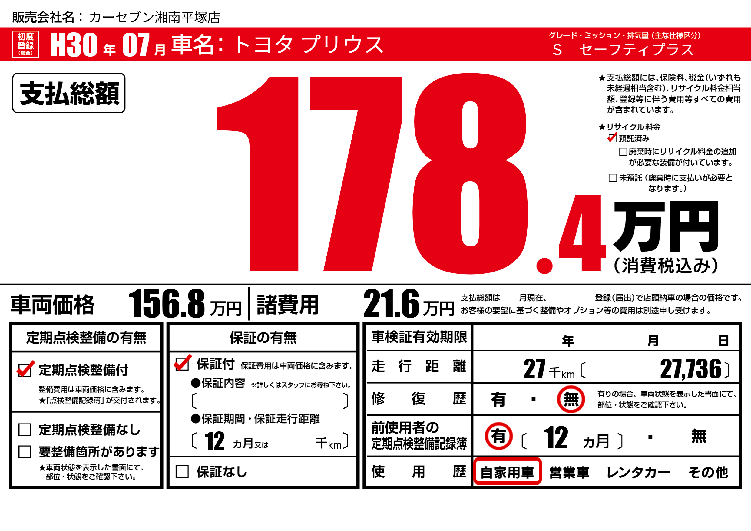 | 車名 | トヨタ プリウス | グレード ミッション 排気量 |