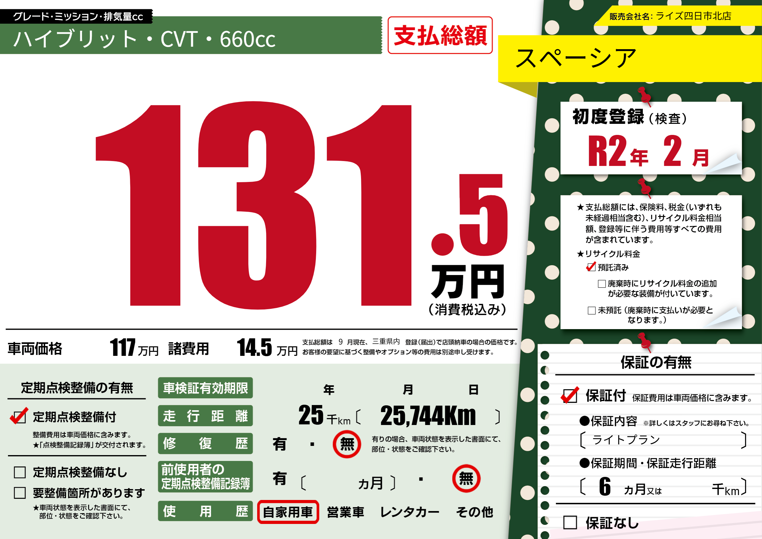 | 車名 | スペーシア | グレード ミッション 排気量 |
