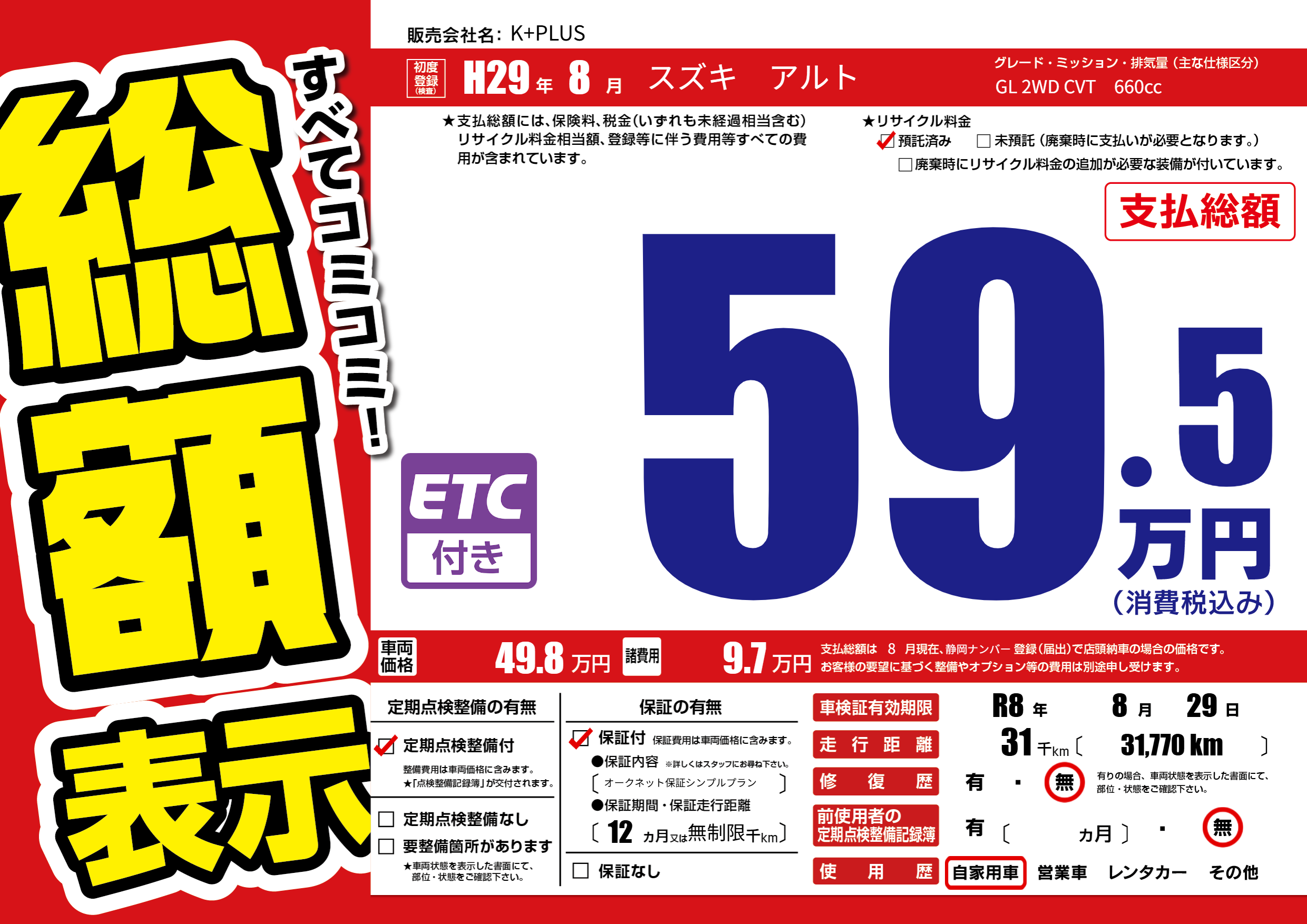 | 車名 | スズキ アルト | グレード ミッション 排気量 |