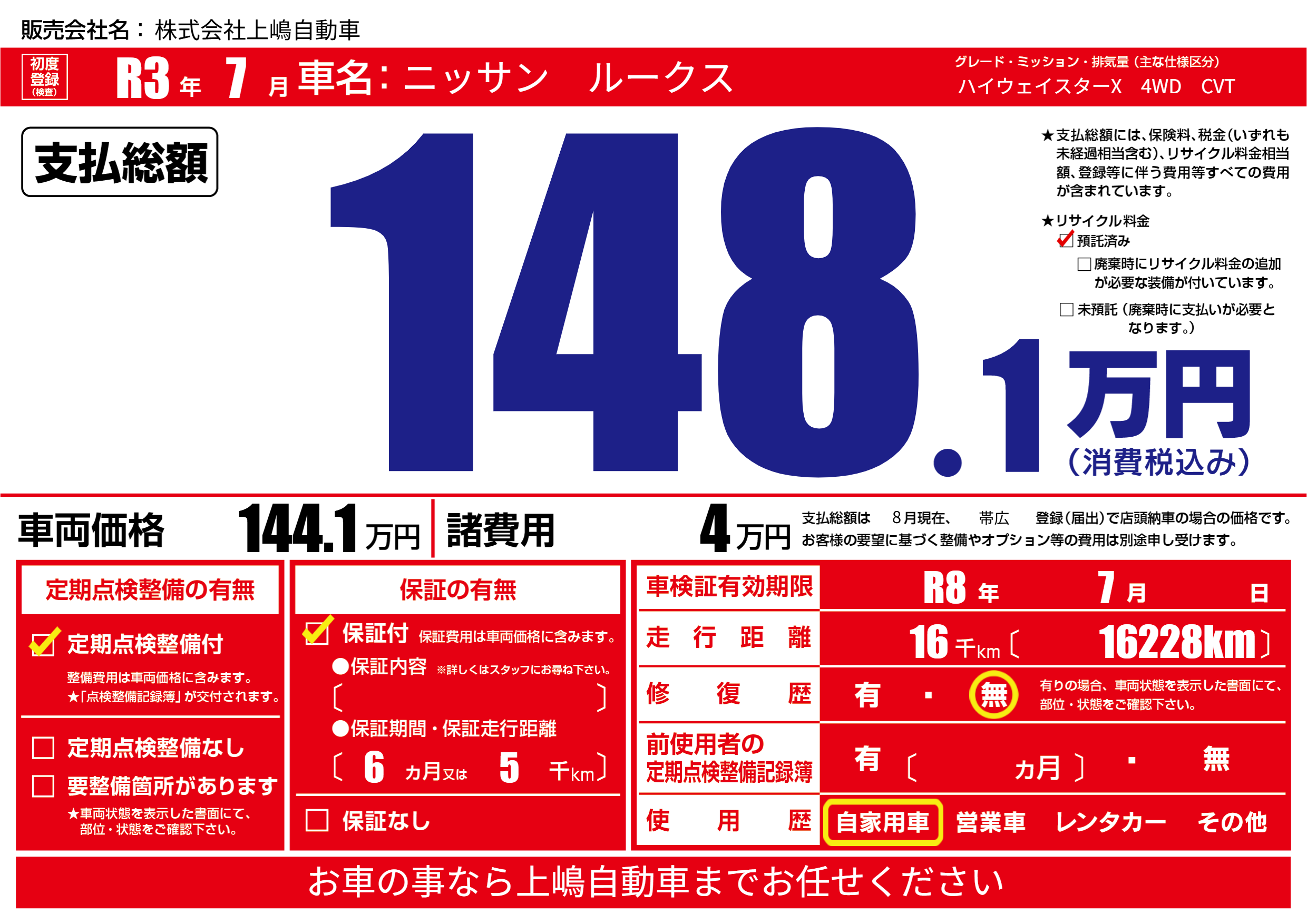 | 車名 | ニッサン ルークス | グレード ミッション 排気量 |