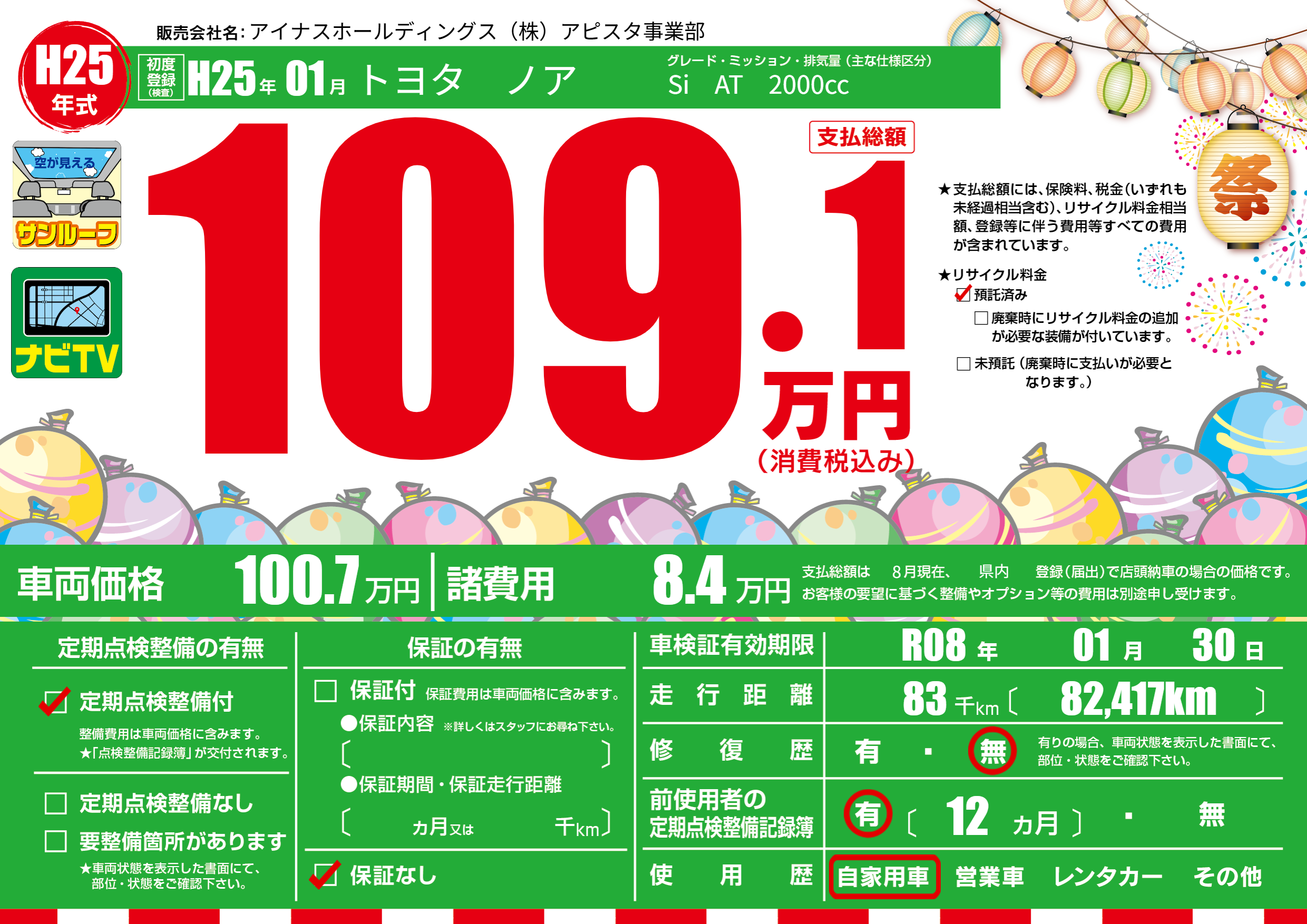 | 走行キロ | 8.3万km | 初年度登録 | H25年01月 |