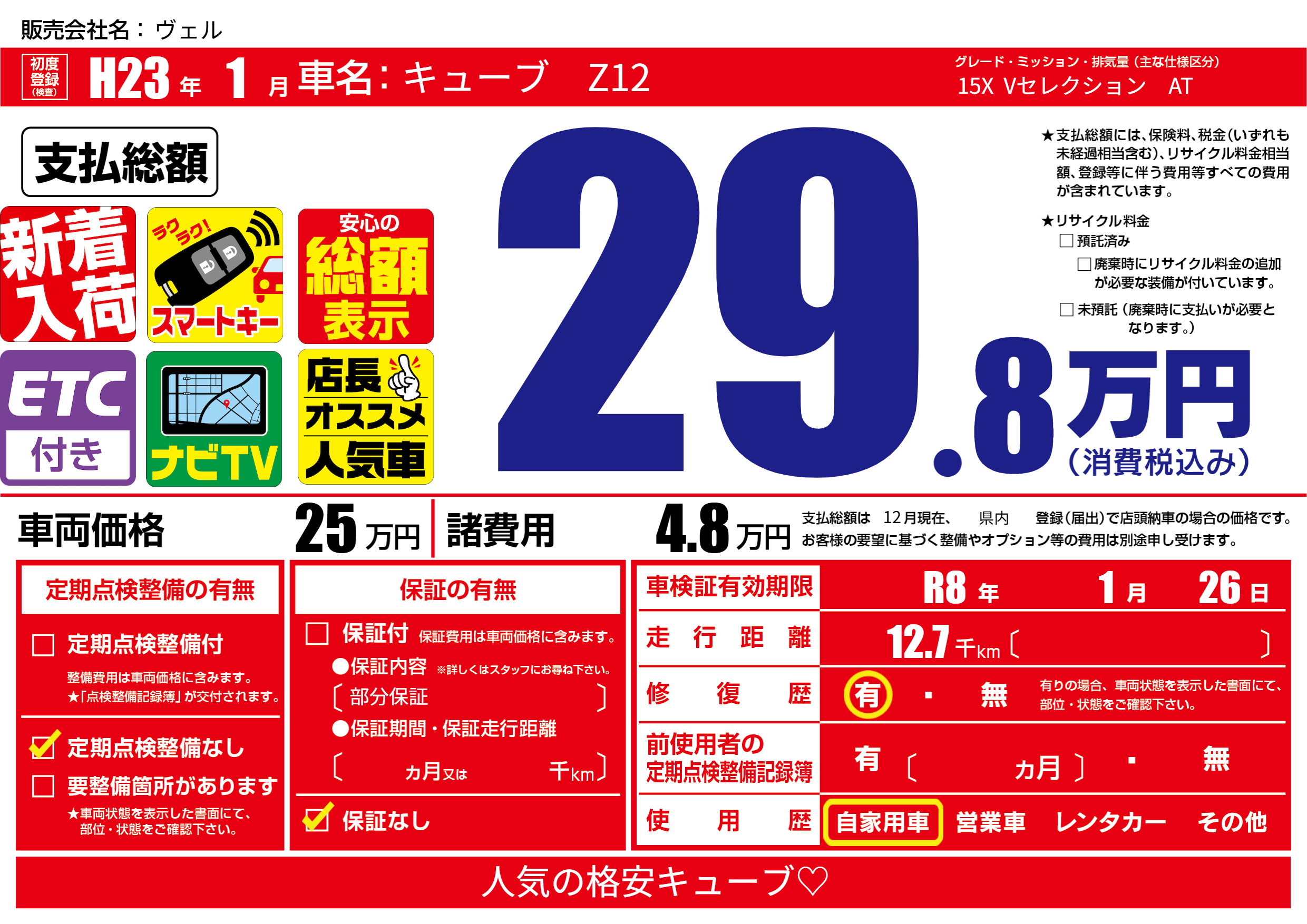 | 車名 | キューブ Z12 | グレード ミッション 排気量 |
