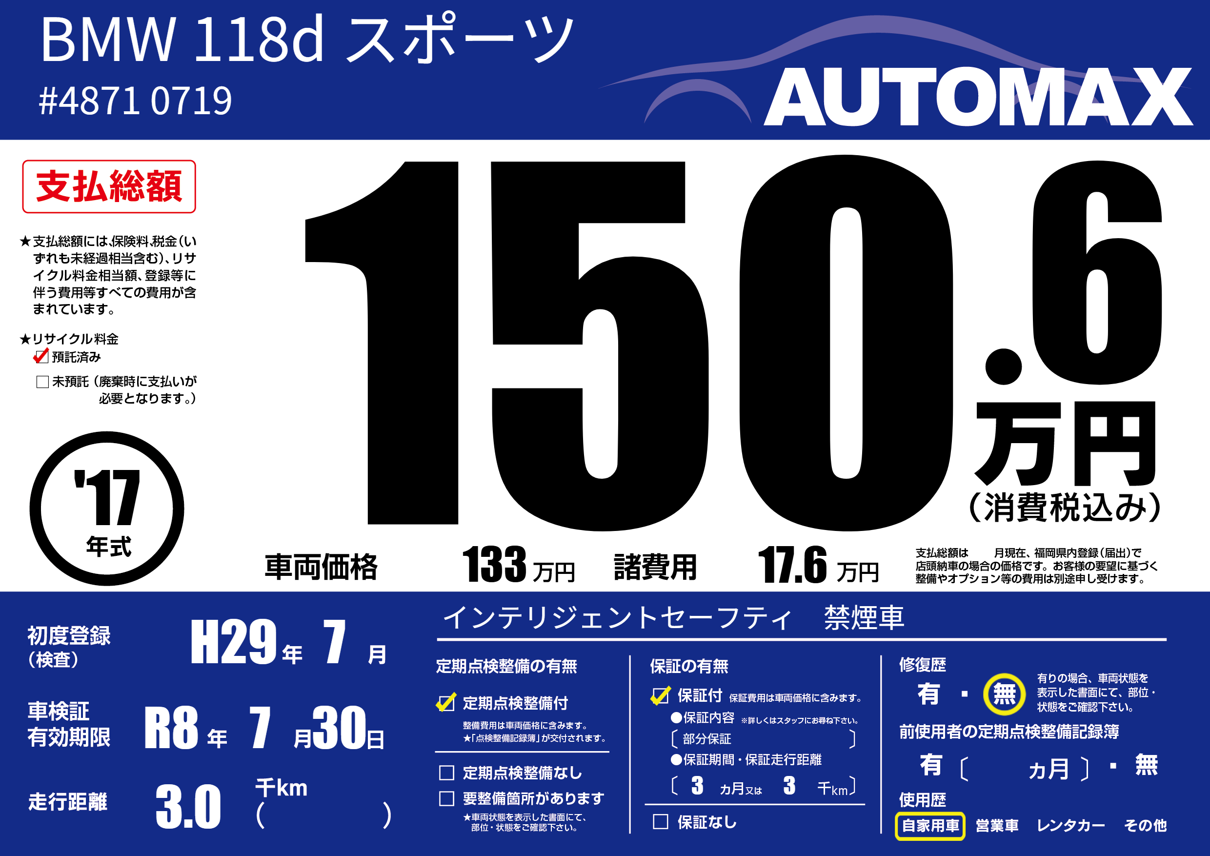 | 車名 | BMW 118d スポーツ | グレード ミッション 排気量 |