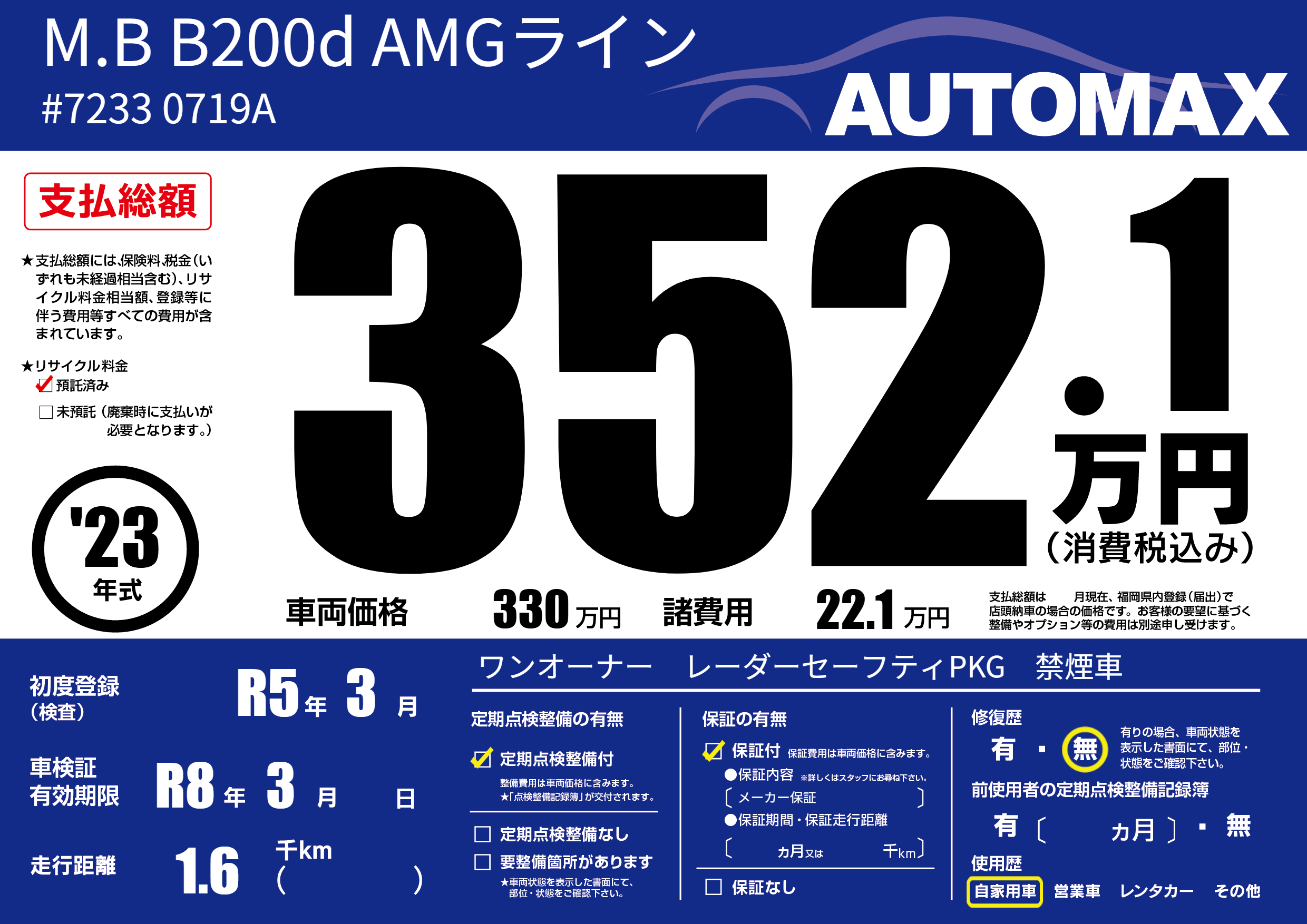 | 車名 | M.B B200d AMGライン | グレード ミッション 排気量 |