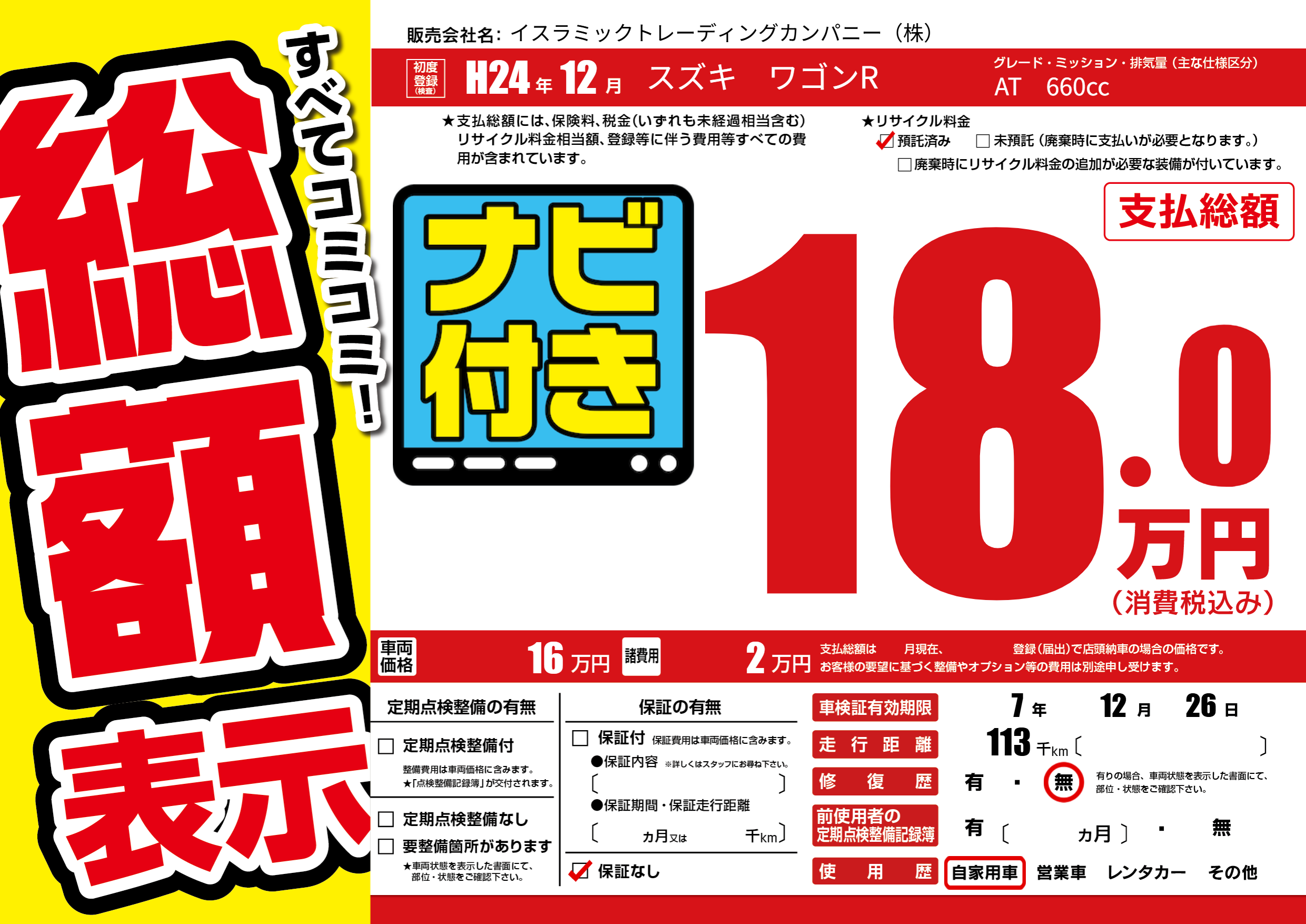| 車名 | スズキ ワゴンR | グレード ミッション 排気量 |