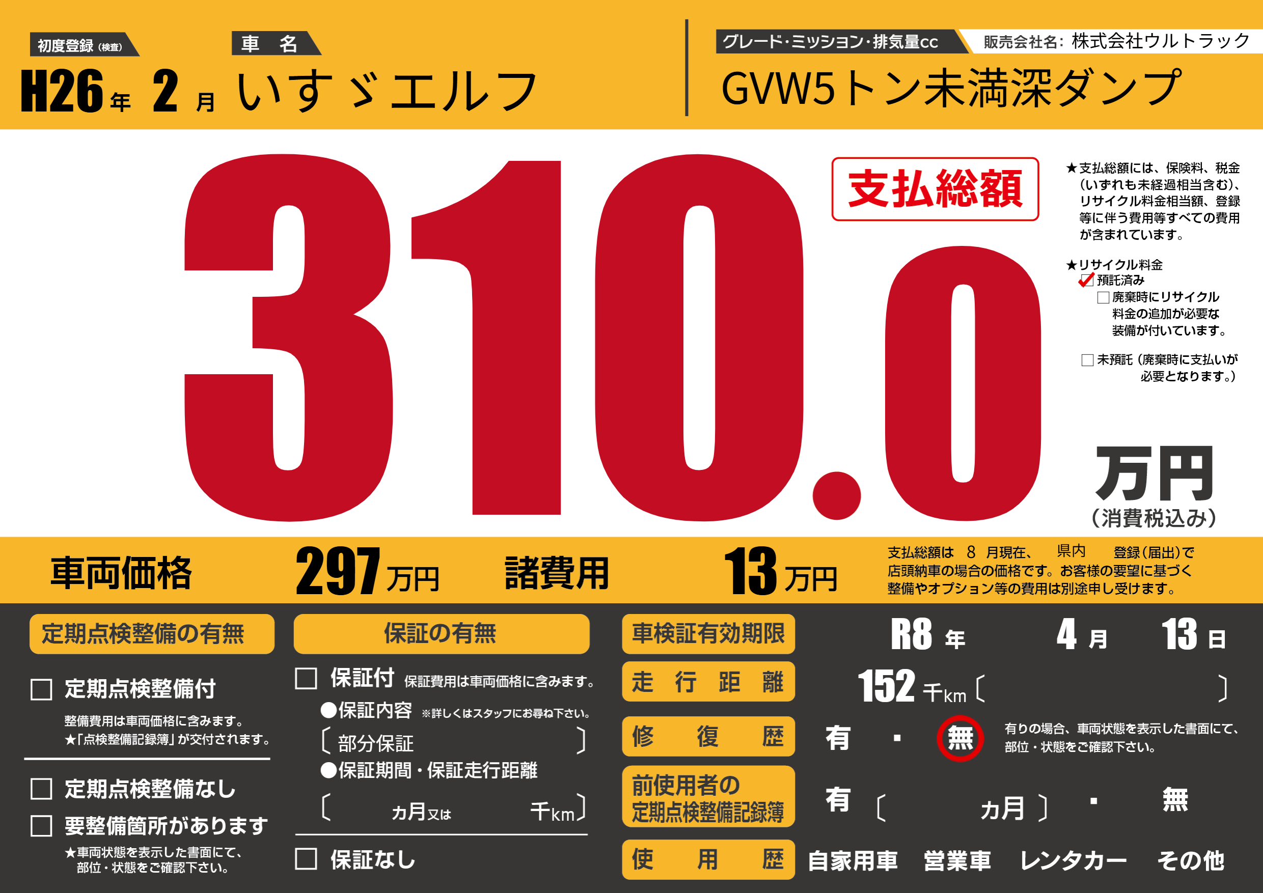 | 走行キロ | 15.2万km | 初年度登録 | H26年2月 |