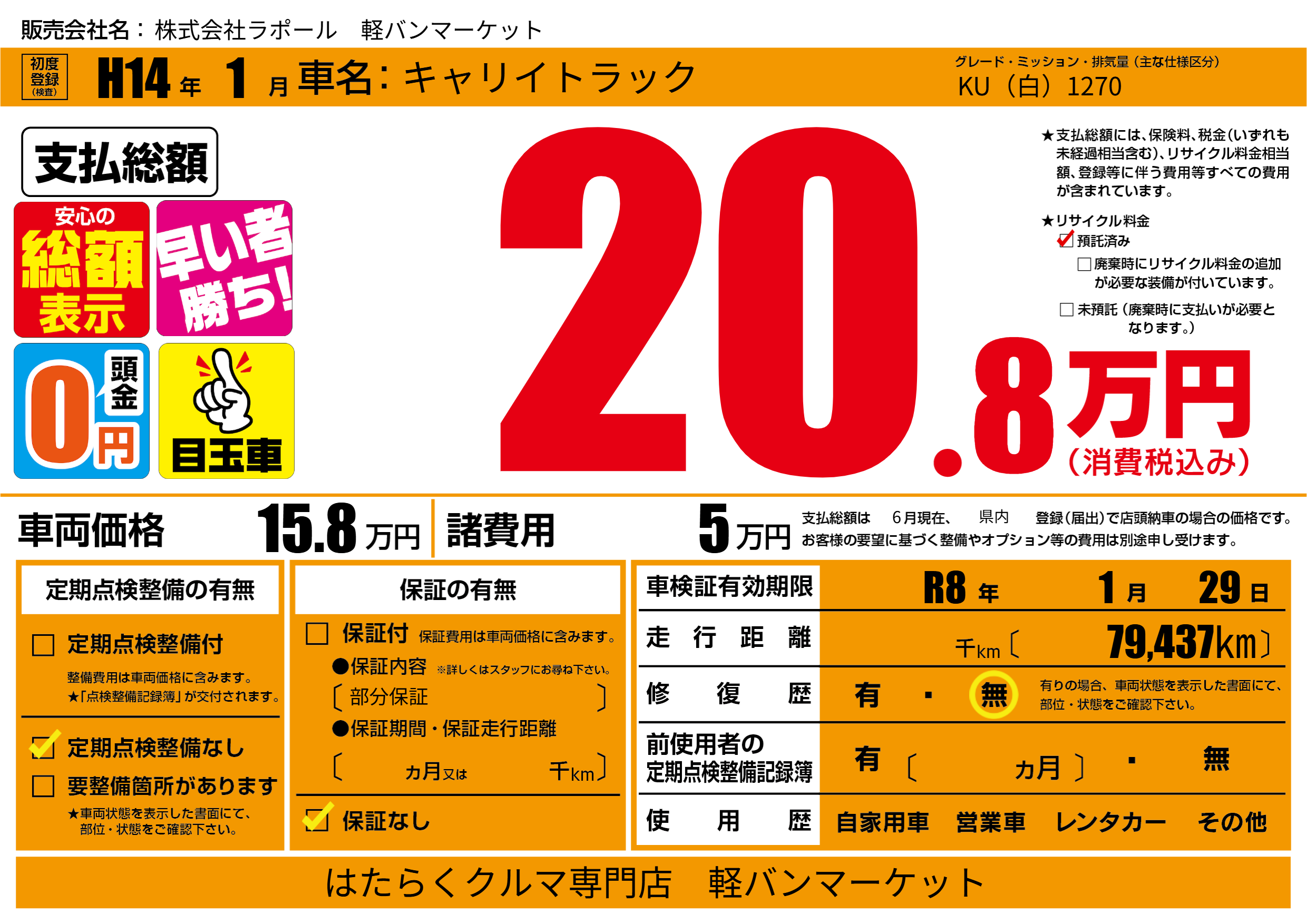 | 走行キロ | - | 初年度登録 | H14年1月 |
