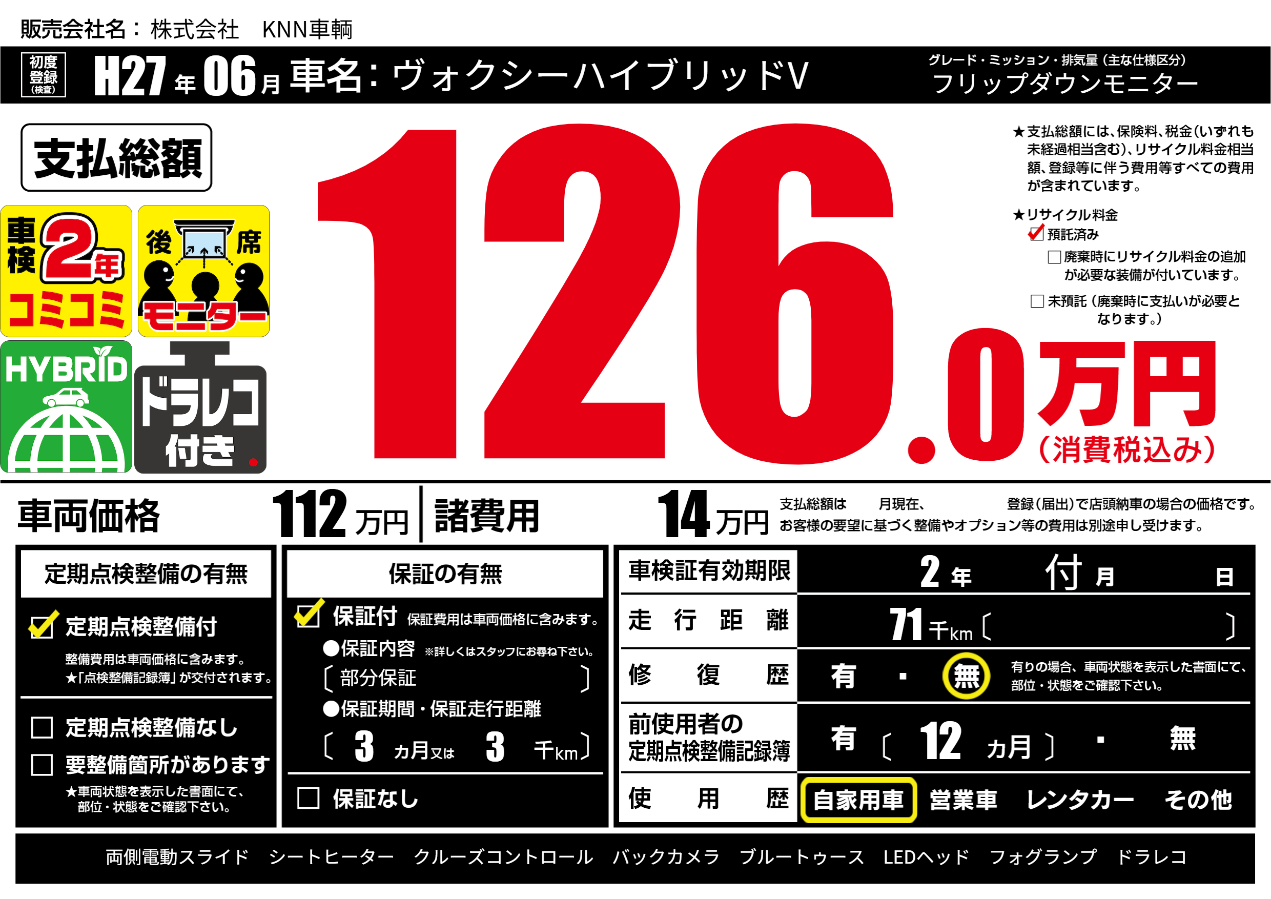 | 走行キロ | 7.1万km | 初年度登録 | H27年06月 |