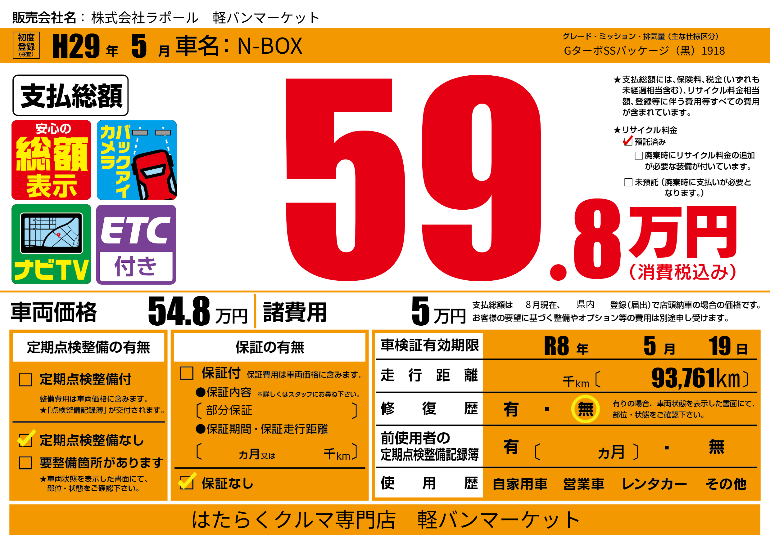 | 車名 | N-BOX | グレード ミッション 排気量 |