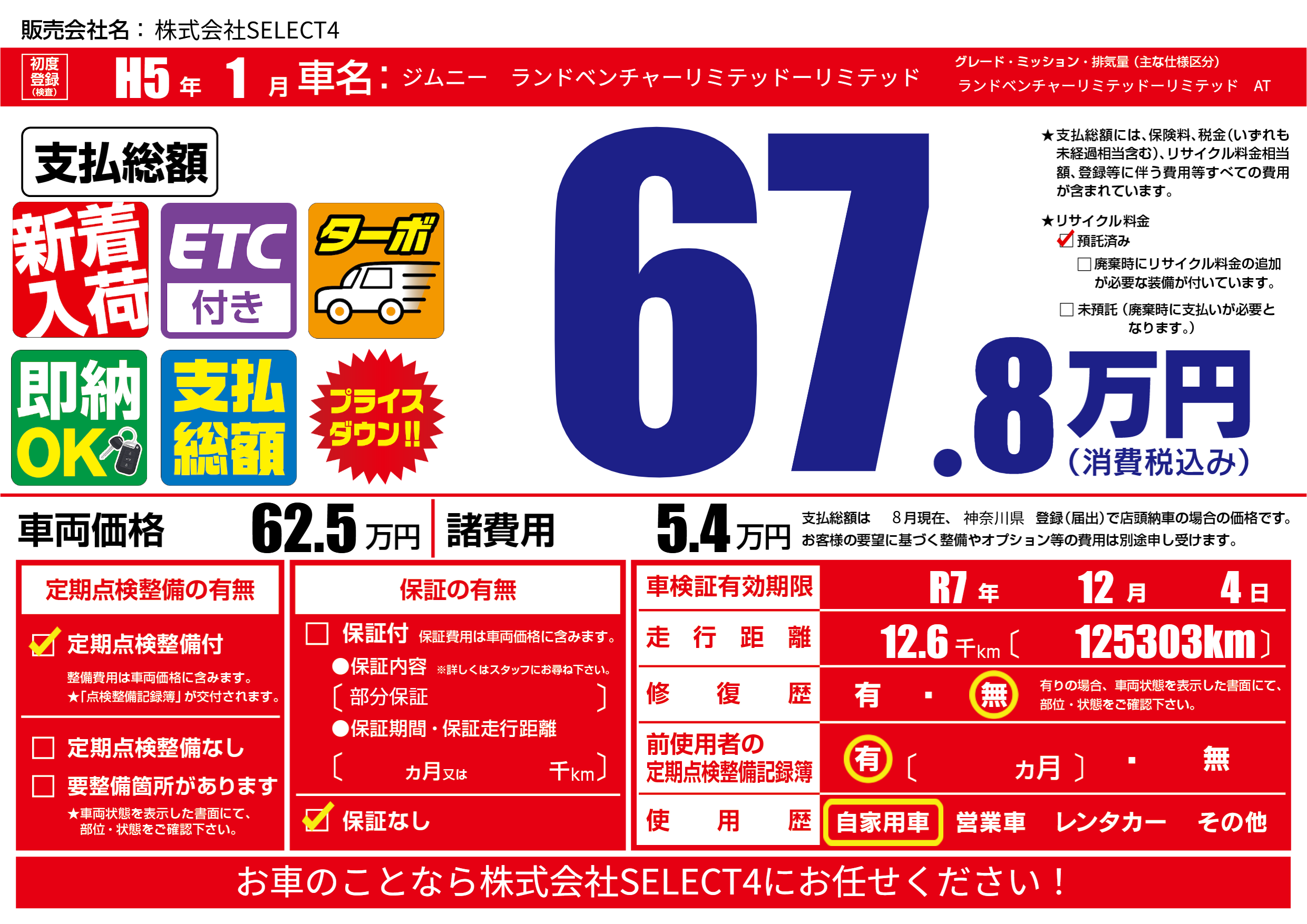 | 車名 | ジムニー ランドベンチャーリミテッドーリミテッド | グレード ミッション 排気量 |