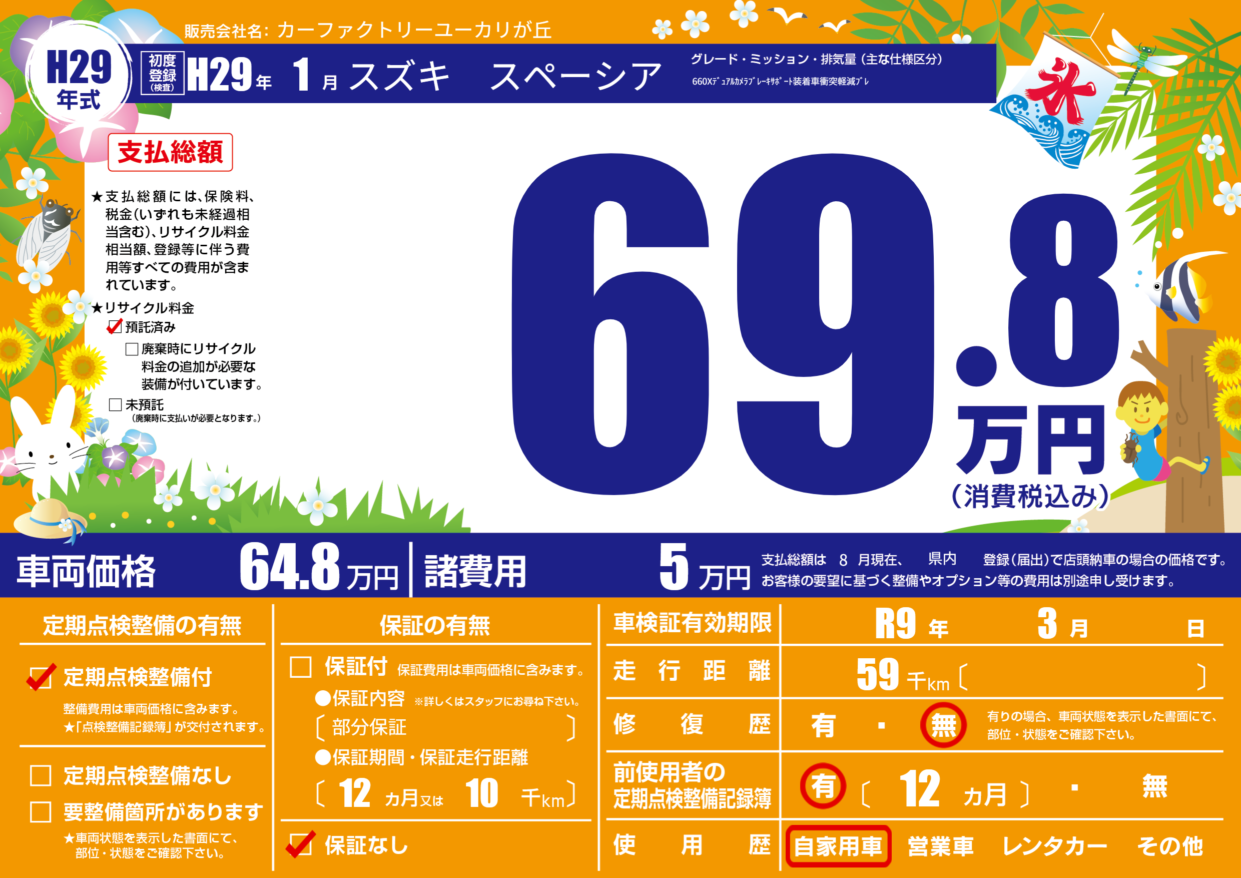 | 車名 | スズキ スペーシア | グレード ミッション 排気量 |