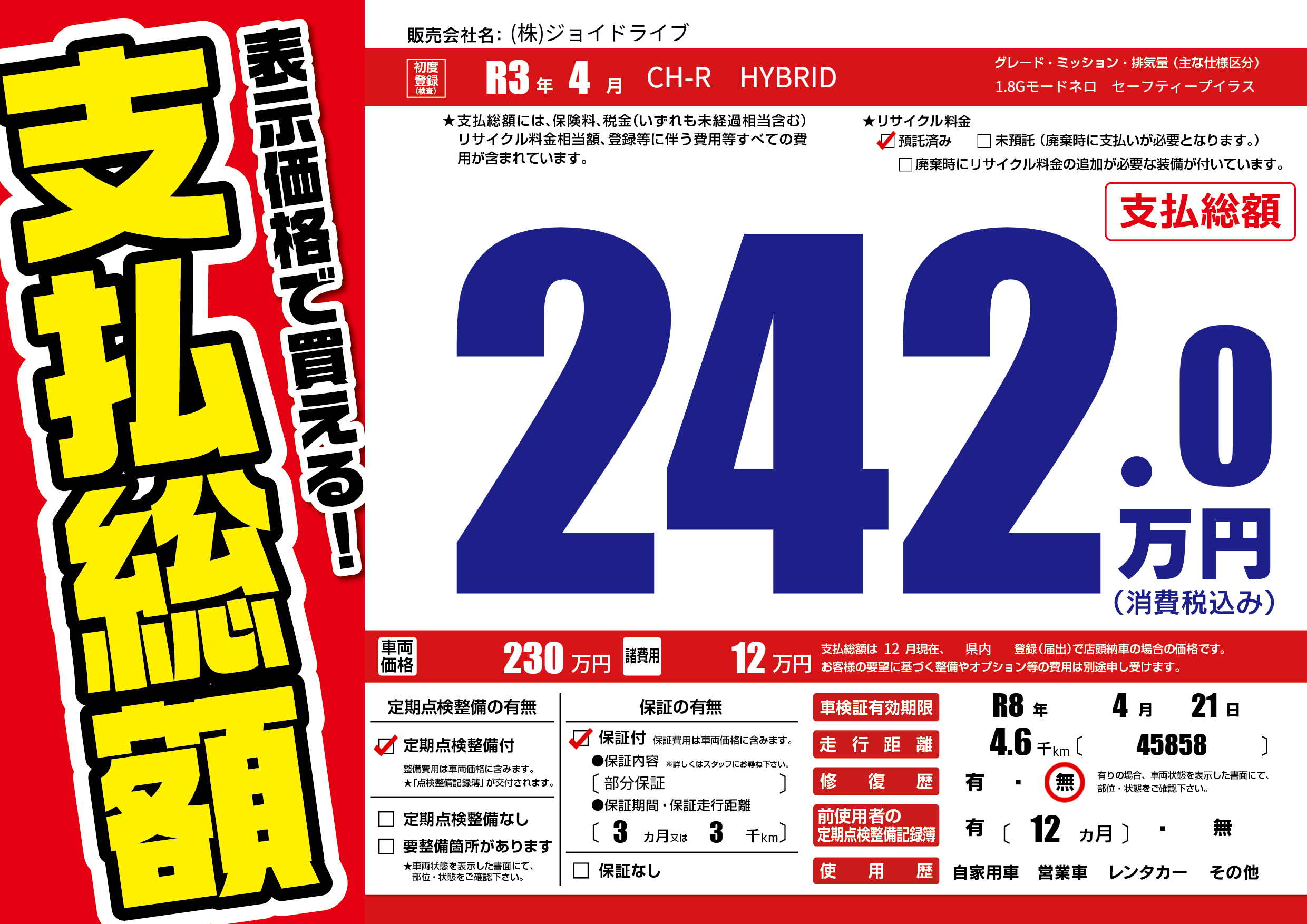 | 車名 | CH-R HYBRID | グレード ミッション 排気量 |