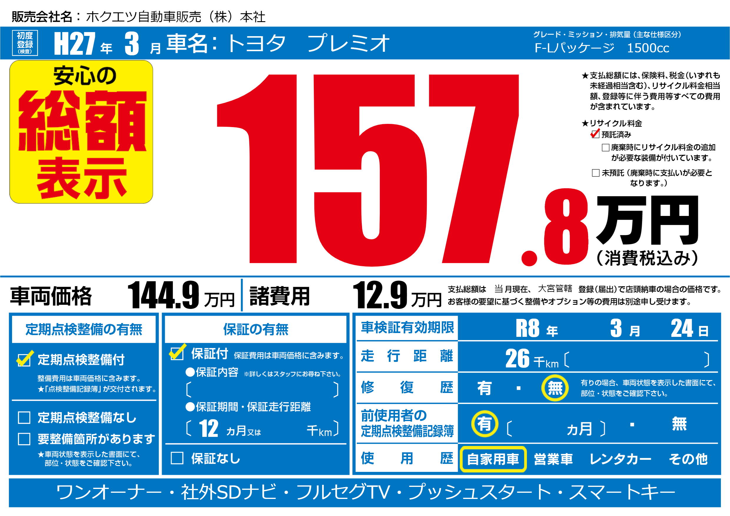 | 車名 | トヨタ プレミオ | グレード ミッション 排気量 |