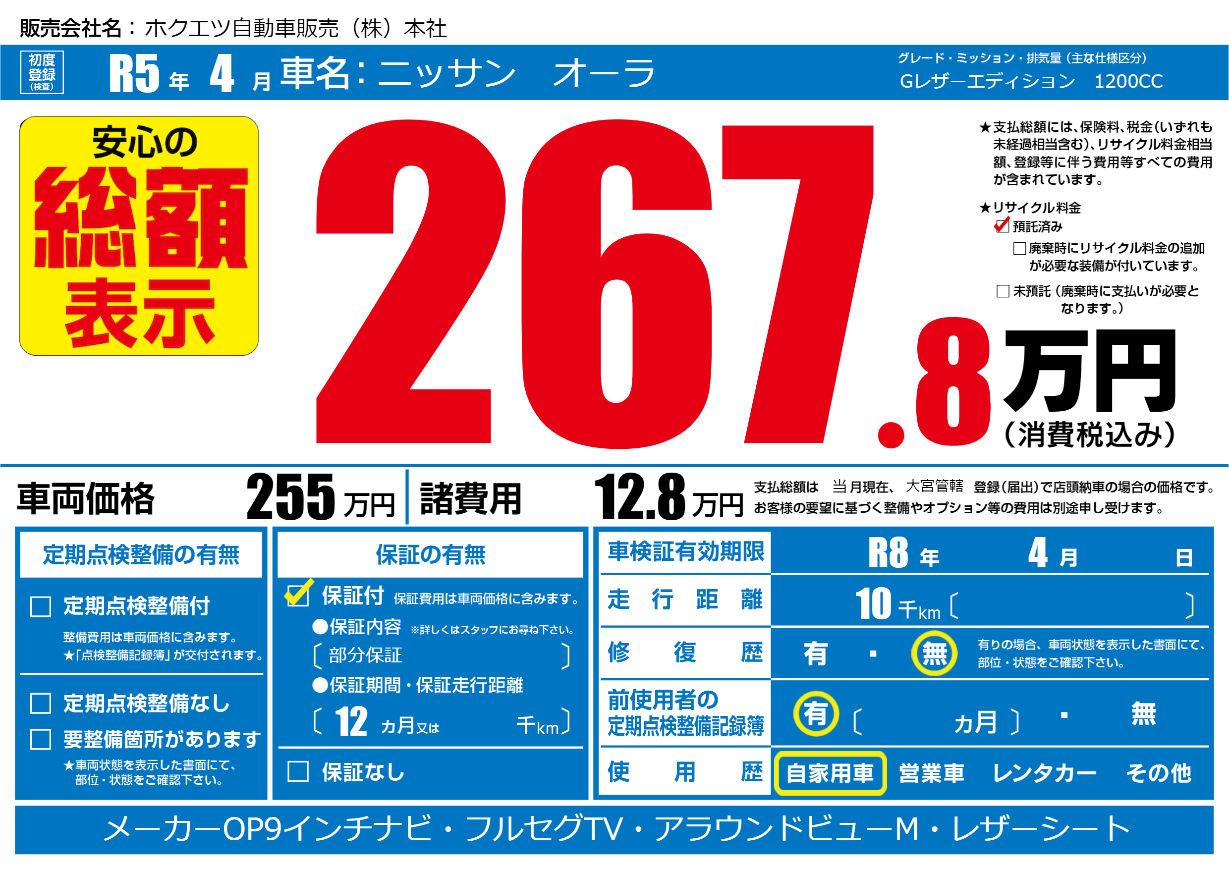 | 車名 | ニッサン オーラ | グレード ミッション 排気量 |