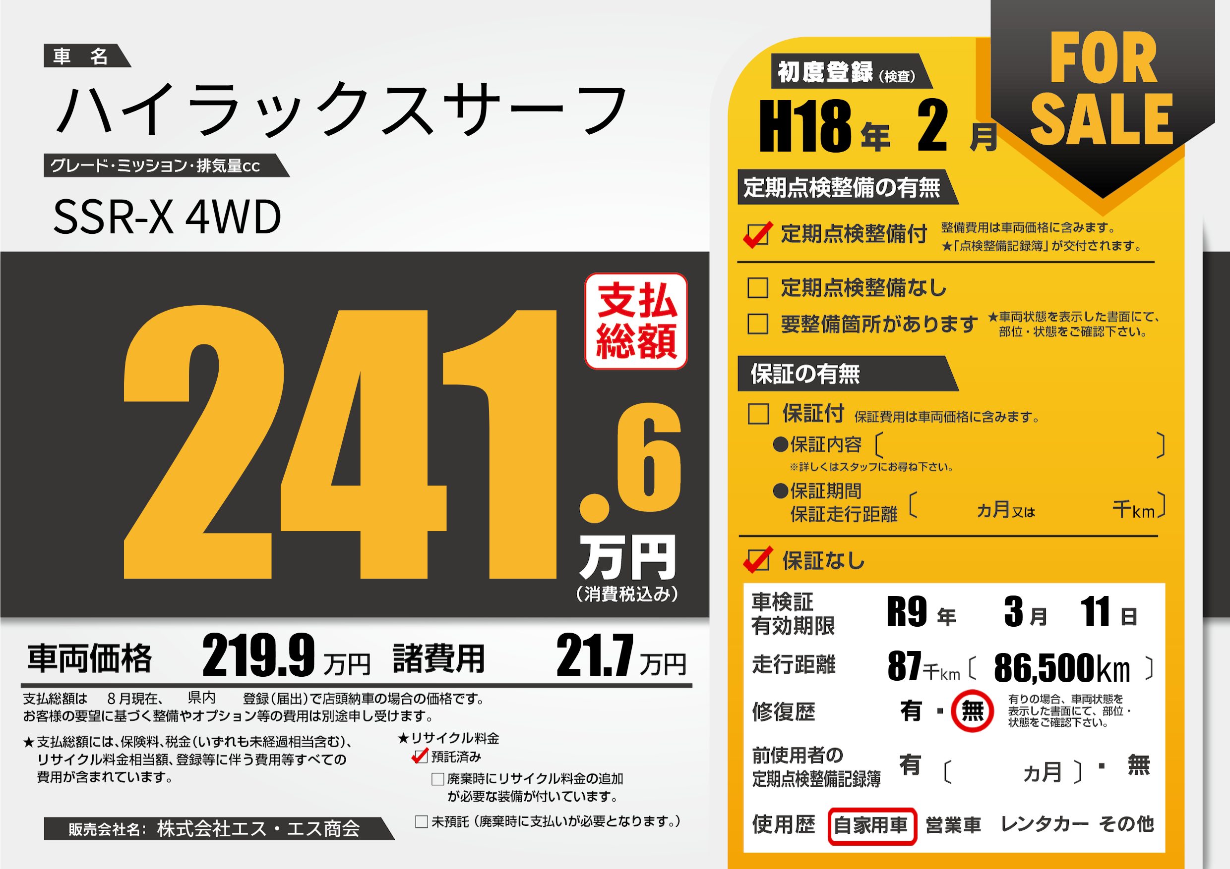 | 車名 | ハイラックスサーフ | グレード ミッション 排気量 |