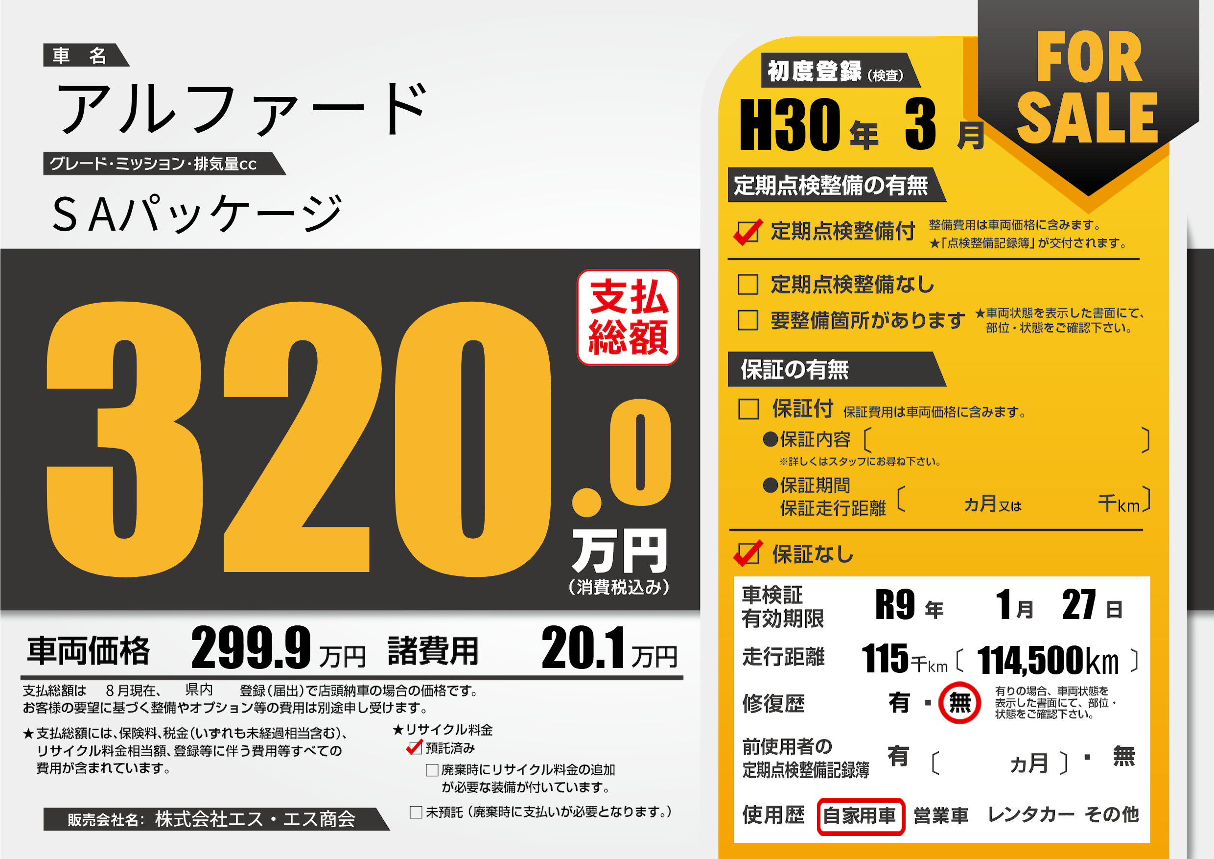 | 車名 | アルファード | グレード ミッション 排気量 |