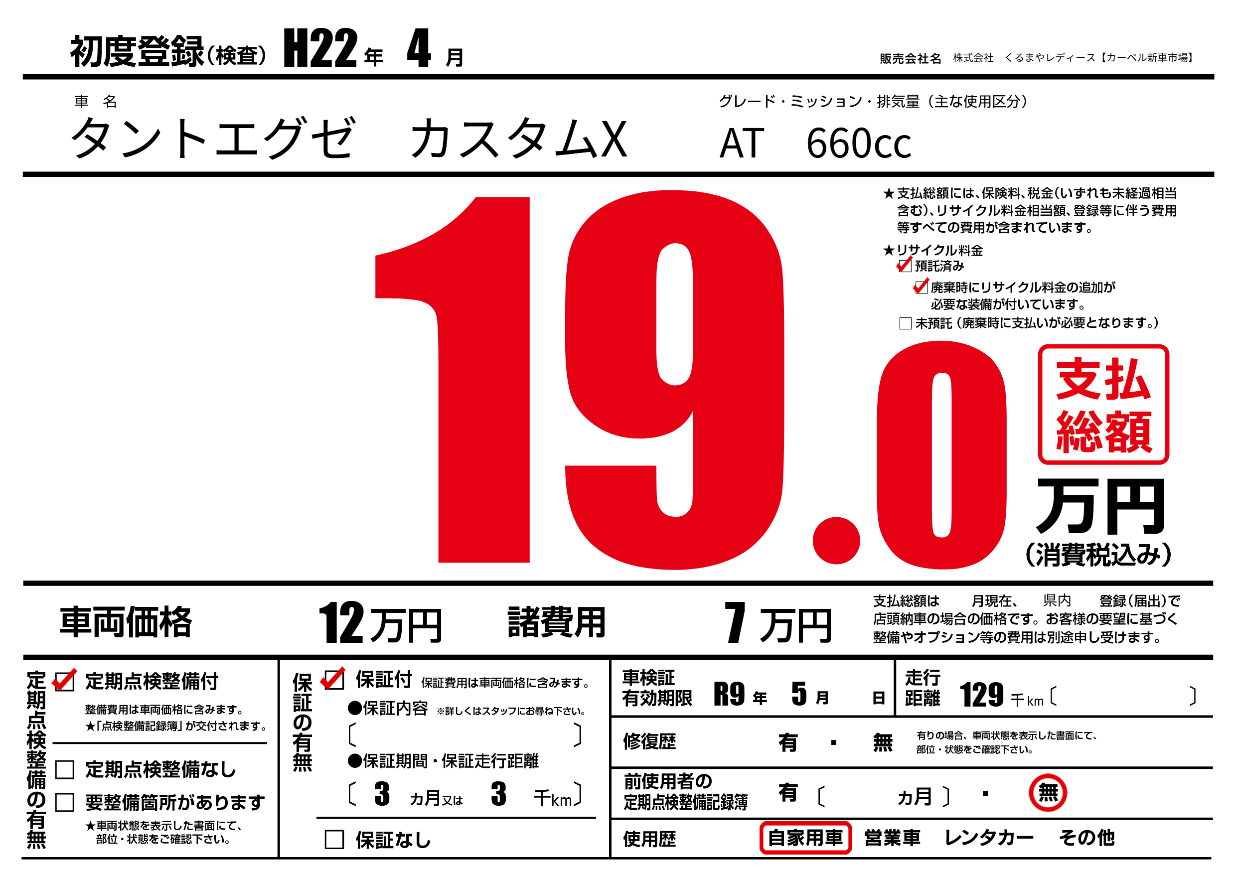 | 走行キロ | 12.9万km | 初年度登録 | H22年4月 |
