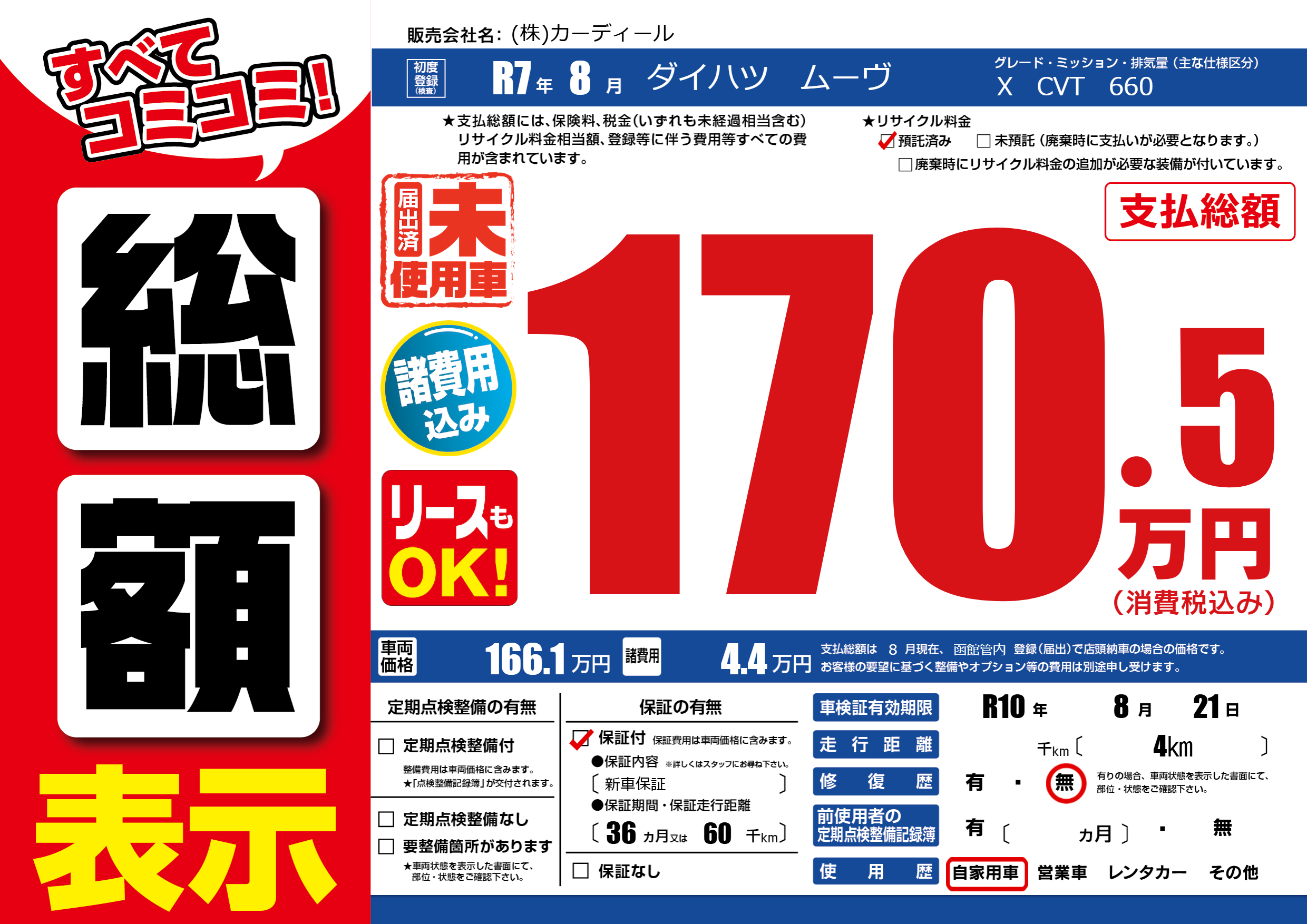 | 走行キロ | - | 初年度登録 | R7年8月 |