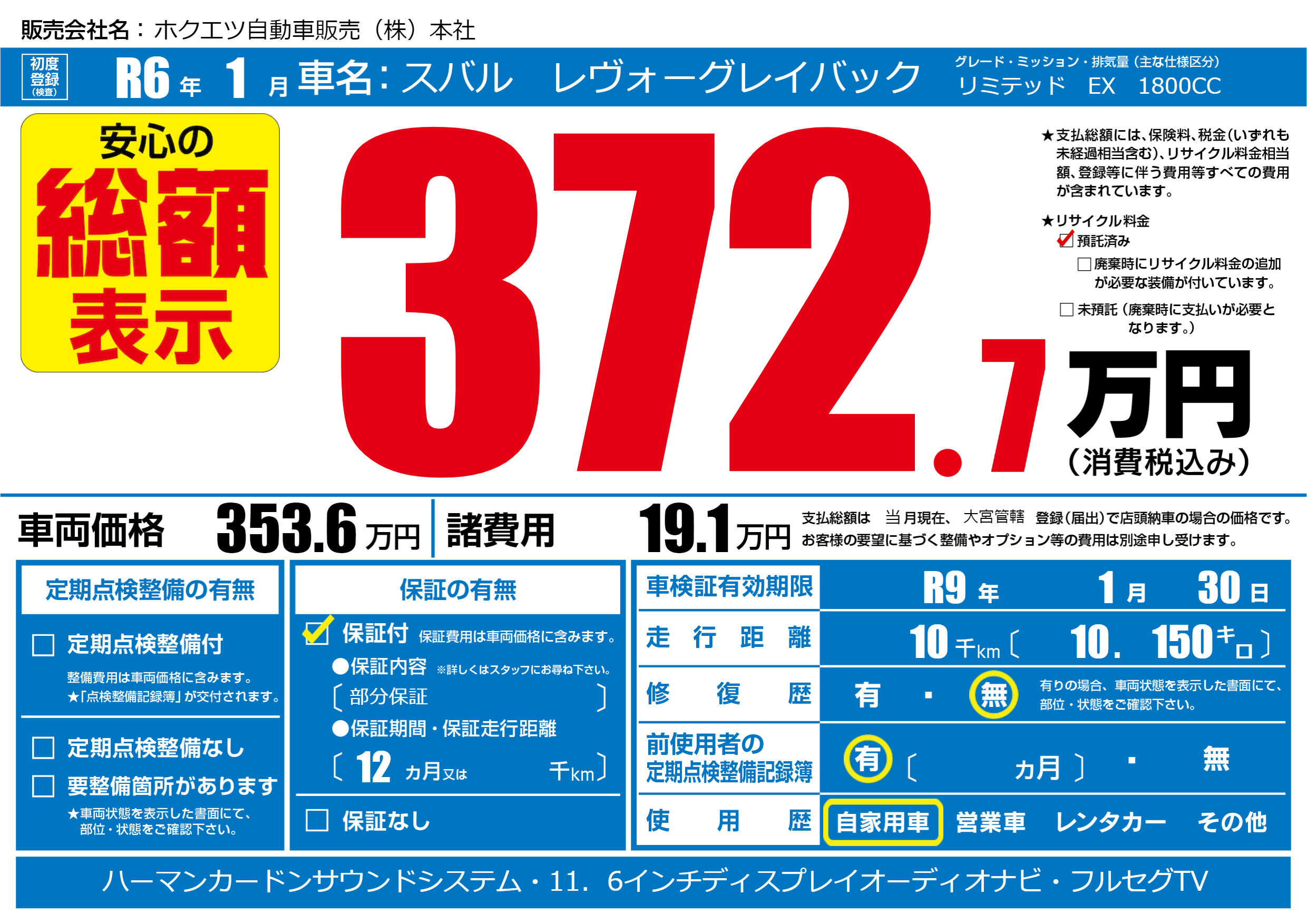 | 車名 | スバル レヴォーグレイバック | グレード ミッション 排気量 |