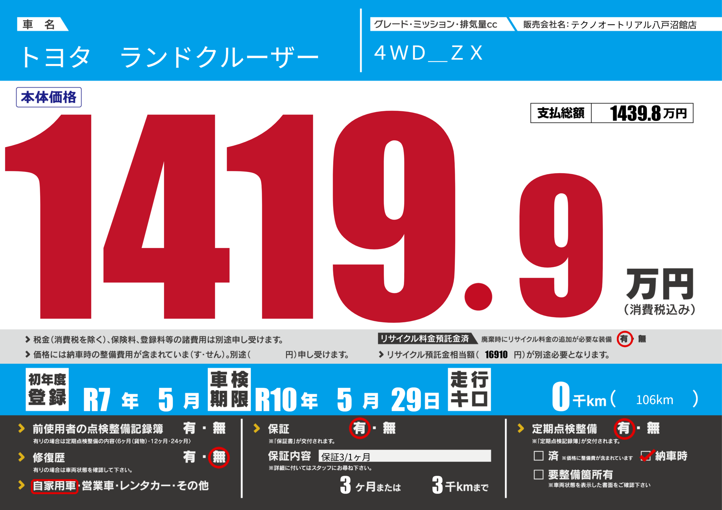 なし | 車検制限 | R10年5月29月 |