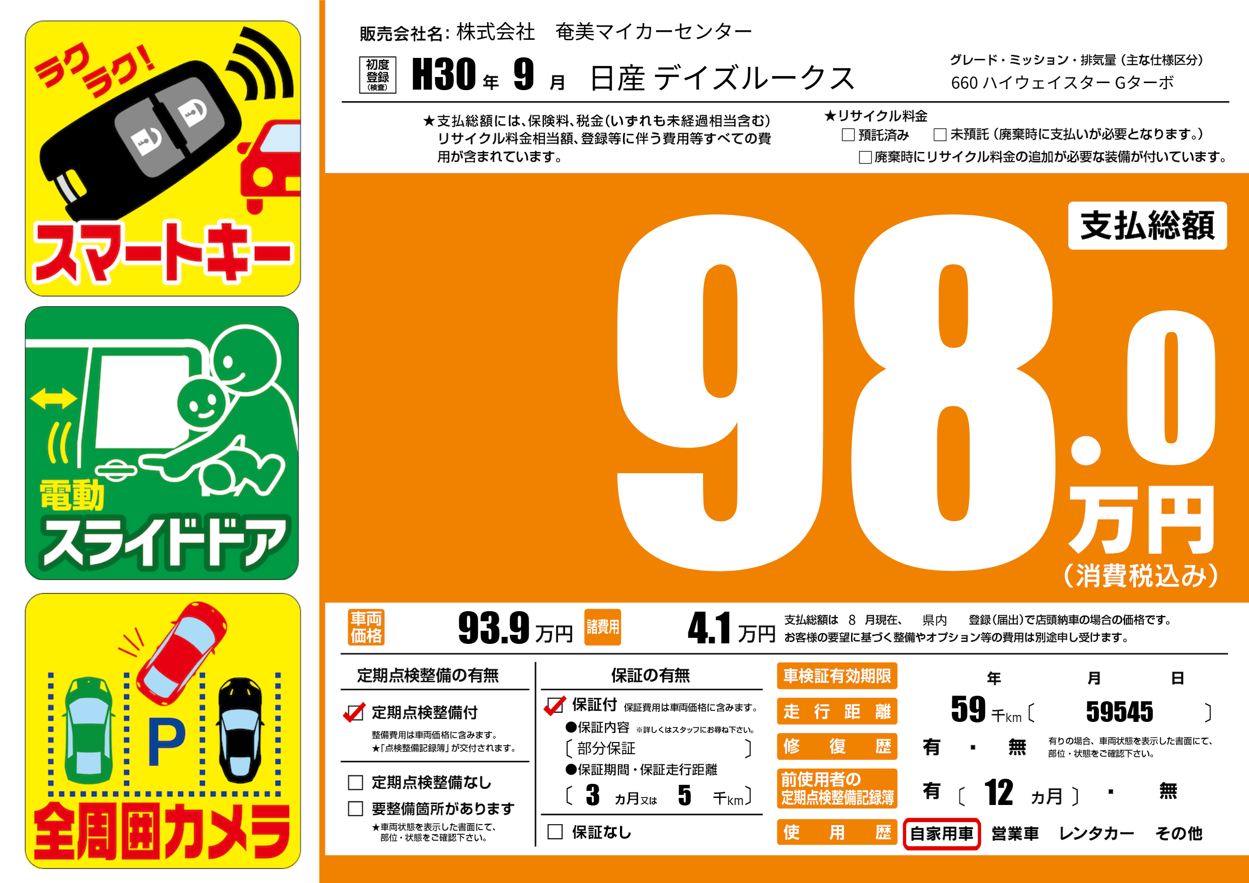 | 走行キロ | 5.9万km | 初年度登録 | H30年9月 |