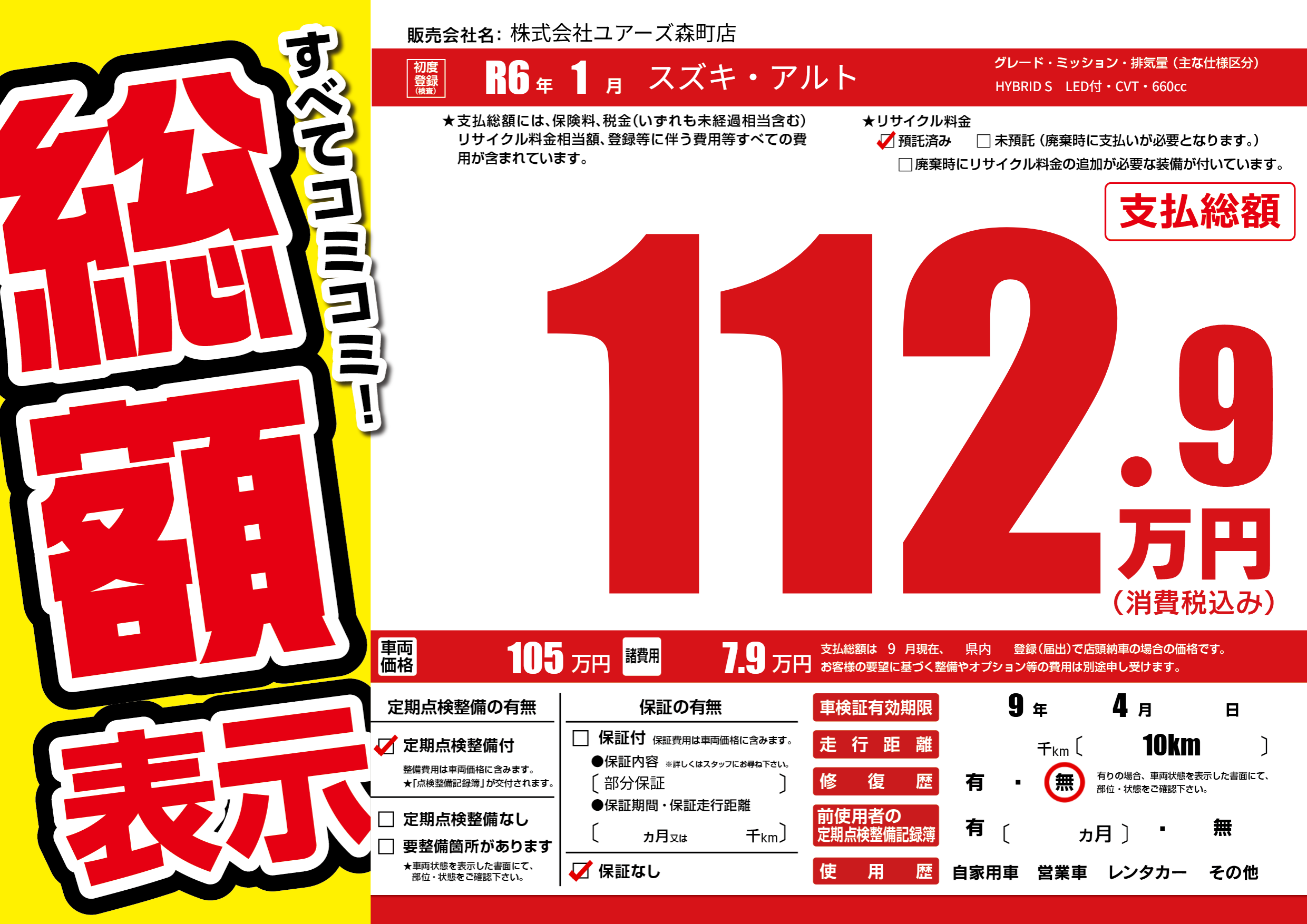 | 車名 | スズキ・アルト | グレード ミッション 排気量 |