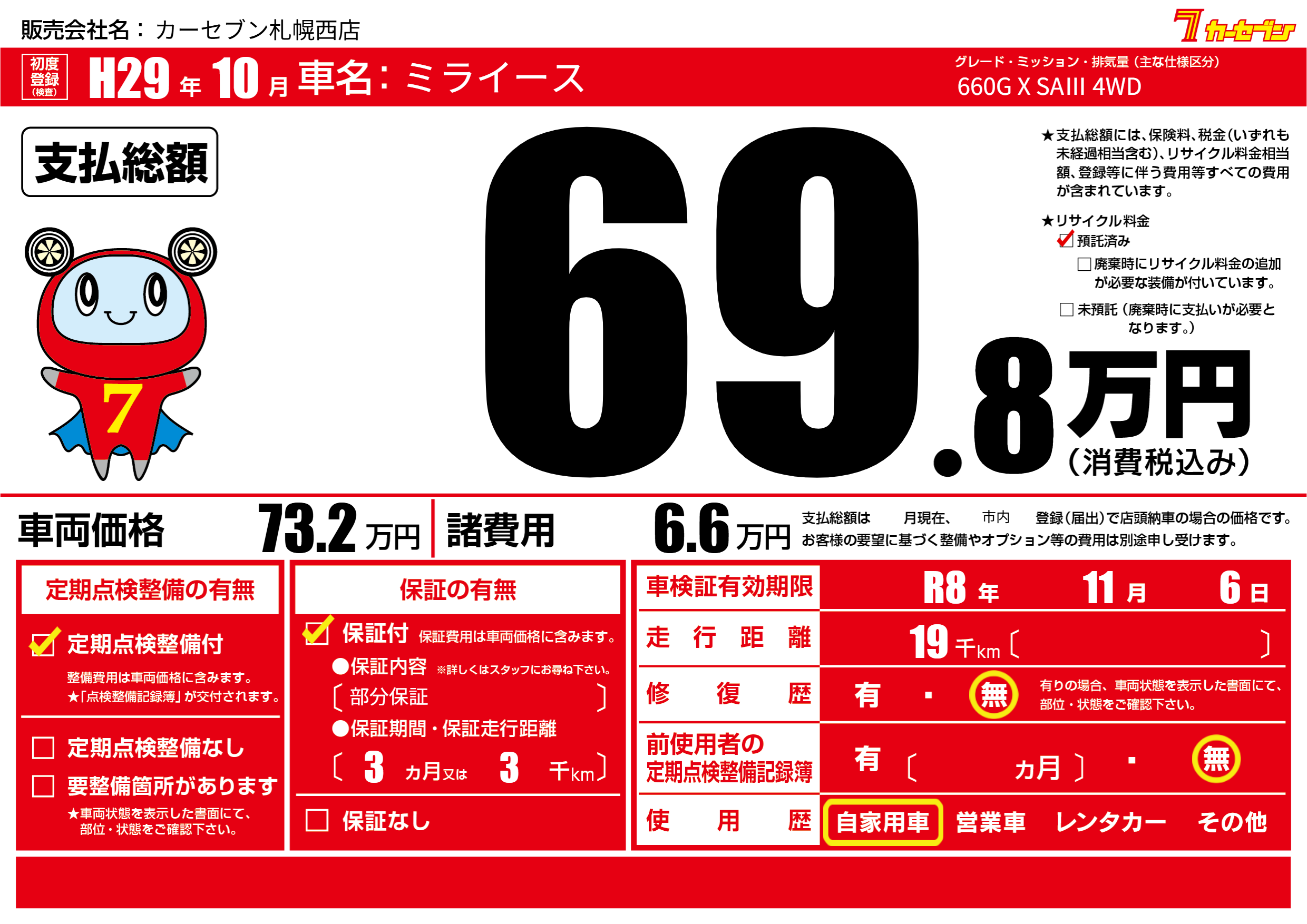 保証付き 保証内容(部分保証) 3ヶ月または(3)千kmまで |