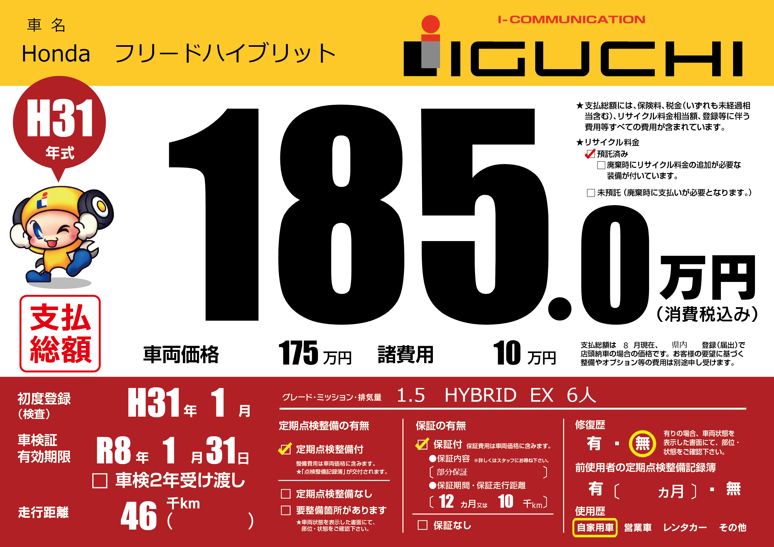 | 車名 | Honda フリードハイブリット | グレード ミッション 排気量 |
