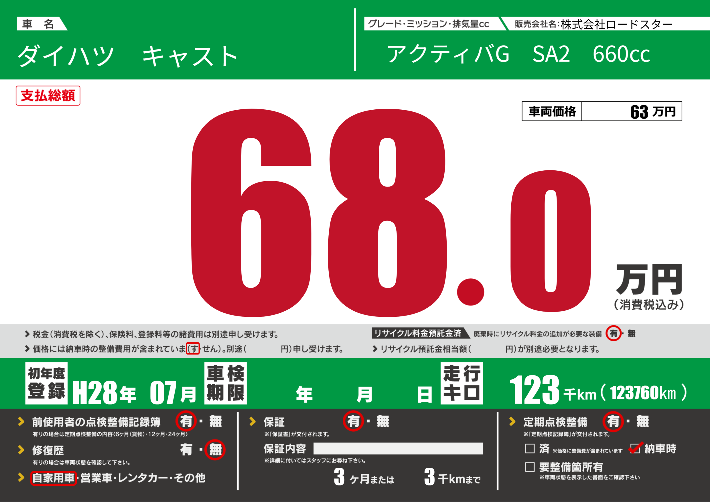 保証付き 保証内容(---) 3ヶ月または(3)千kmまで |