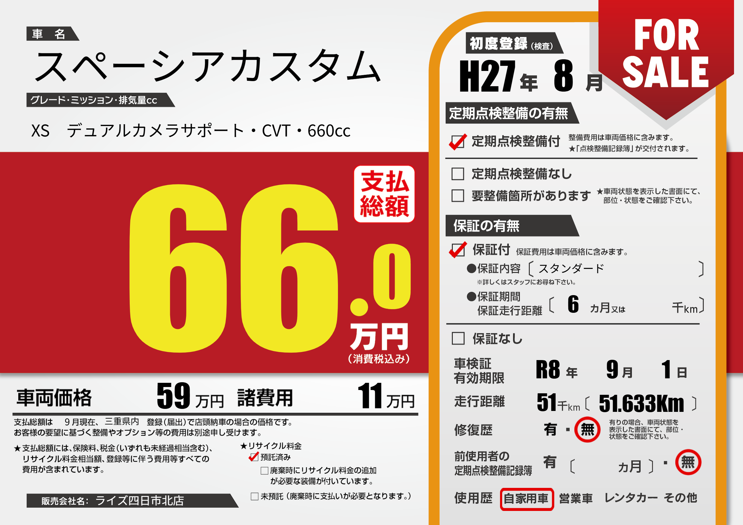 なし | 車検制限 | R8年9月1月 |