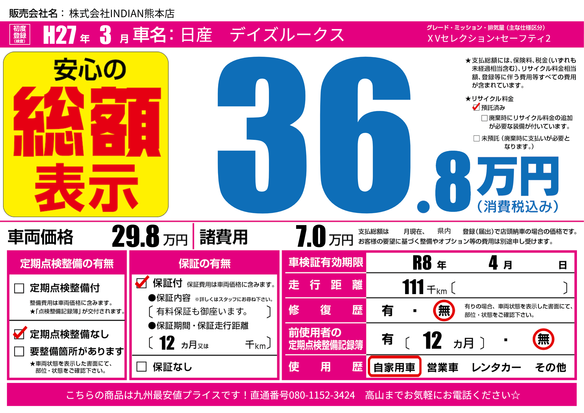 | 走行キロ | 11.1万km | 初年度登録 | H27年3月 |