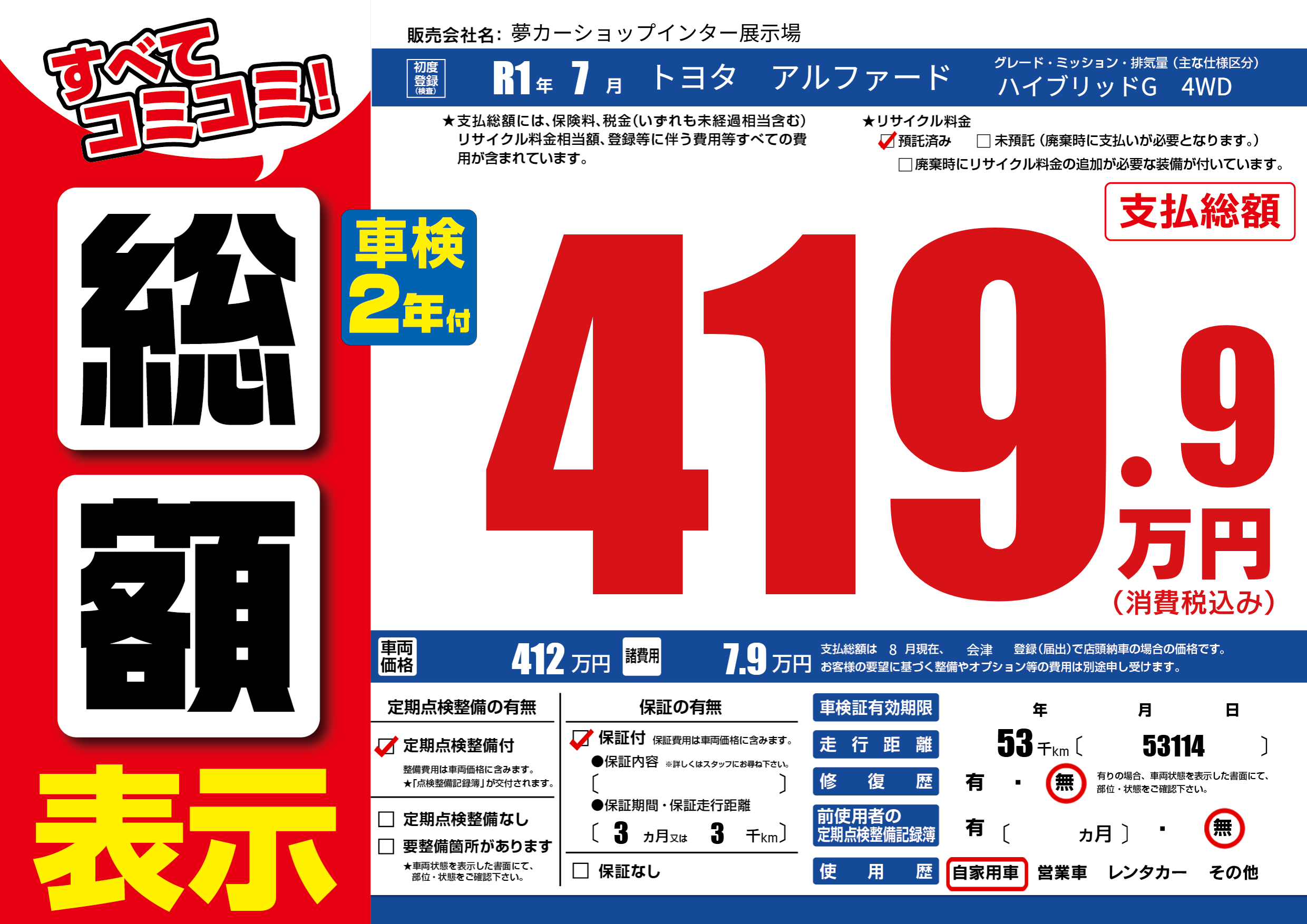 | 車名 | トヨタ アルファード | グレード ミッション 排気量 |