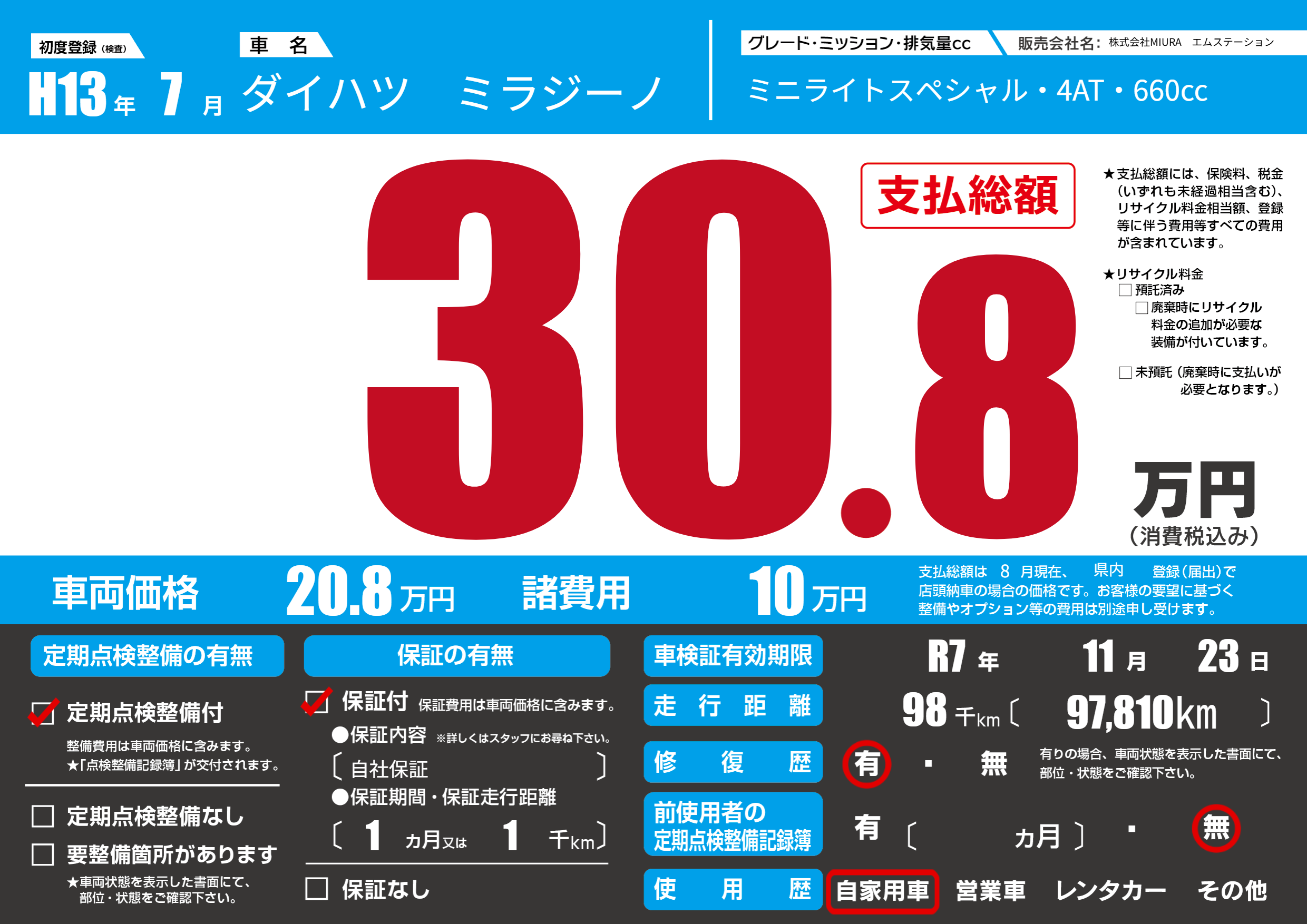 | 走行キロ | 9.8万km | 初年度登録 | H13年7月 |