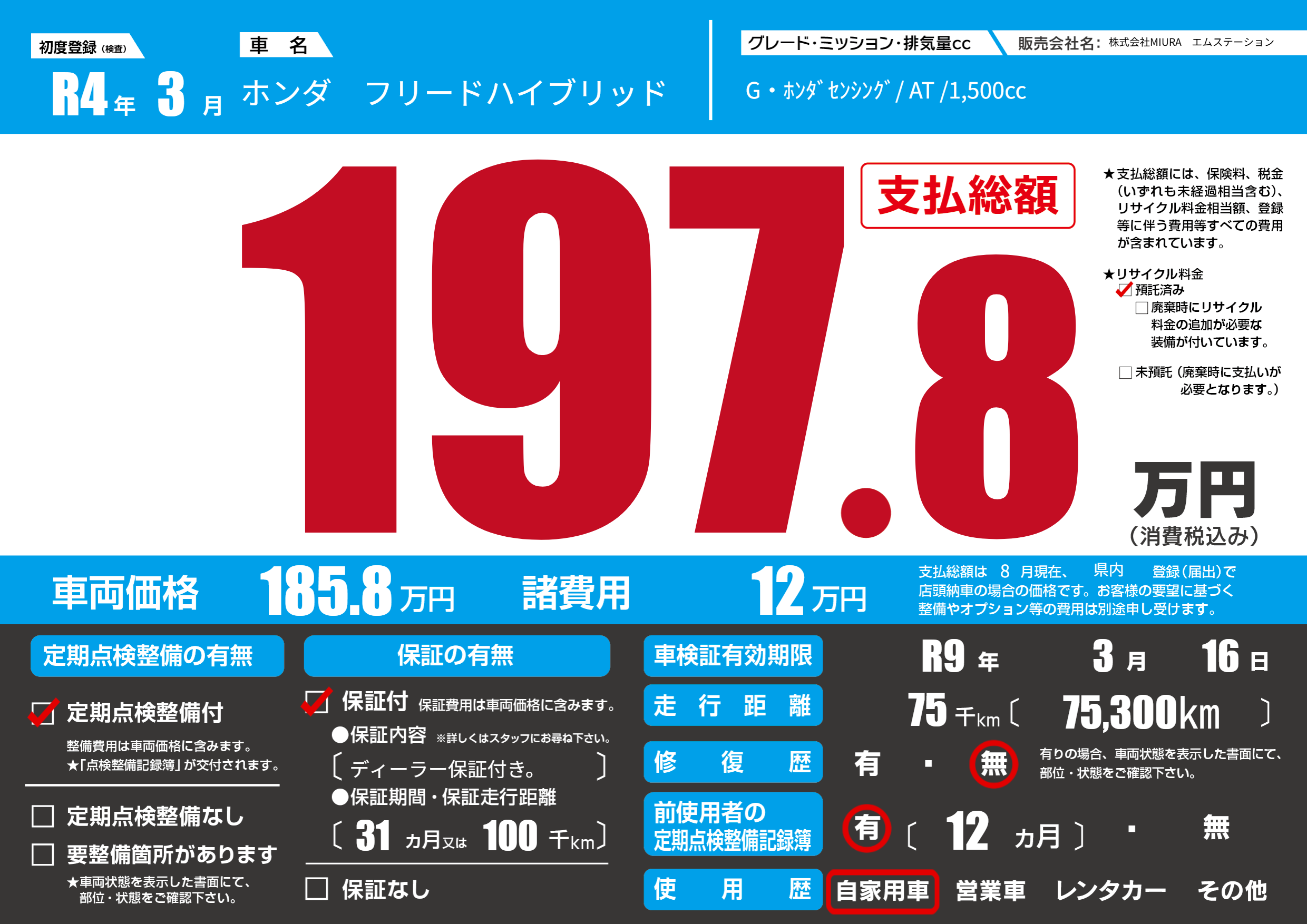 | 車名 | ホンダ フリードハイブリッド | グレード ミッション 排気量 |